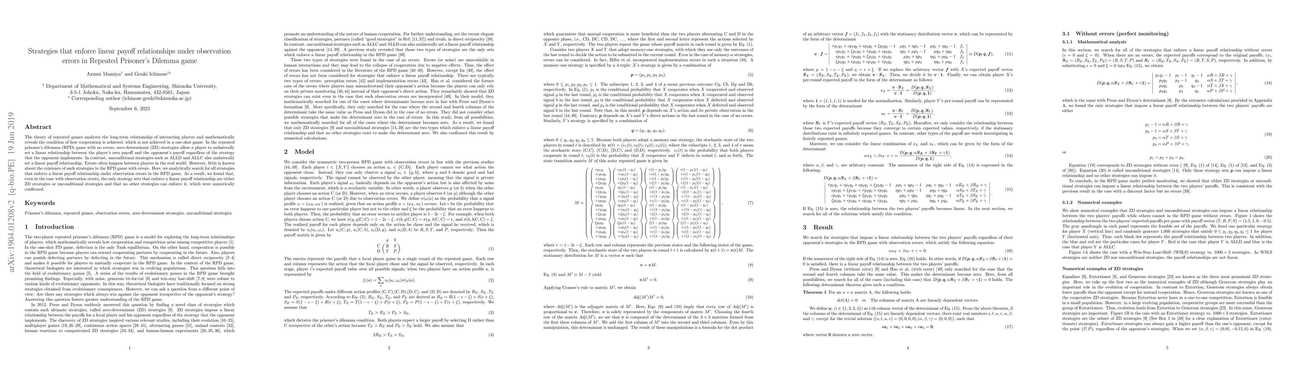 The theory of repeated games analyzes the long-term relationship of interacting players and mathematically reveals the condition of how cooperation is achieved, which is not achieved in a one-shot game. In the repeated prisoner's dilemma (RPD) game with no errors, zero-determinant (ZD) strategies allow a player to unilaterally set a linear relationship between the player's own payoff and the opponent's payoff regardless of the strategy that the opponent implements. In contrast, unconditional strategies such as ALLD and ALLC also unilaterally set a linear payoff relationship. Errors often happen between players in the real world. However, little is known about the existence of such strategies in the RPD game with errors. Here, we analytically search for all strategies that enforce a linear payoff relationship under observation errors in the RPD game. As a result, we found that, even in the case with observation errors, the only strategy sets that enforce a linear payoff relationship are either ZD strategies or unconditional strategies and that no other strategies can enforce it, which were numerically confirmed.