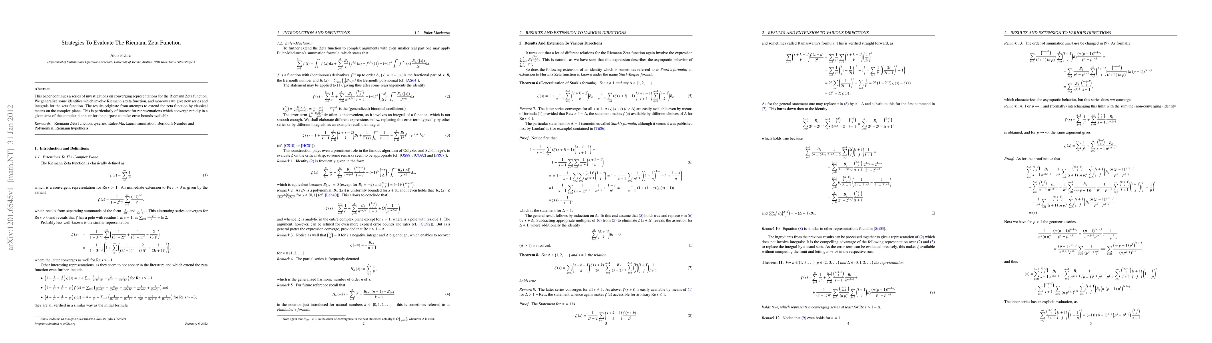 This paper continues a series of investigations on converging representations for the Riemann Zeta function. We generalize some identities which involve Riemann's zeta function, and moreover we give new series and integrals for the zeta function. The results originate from attempts to extend the zeta function by classical means on the complex plane. This is particularly of interest for representations which converge rapidly in a given area of the complex plane, or for the purpose to make error bounds available.