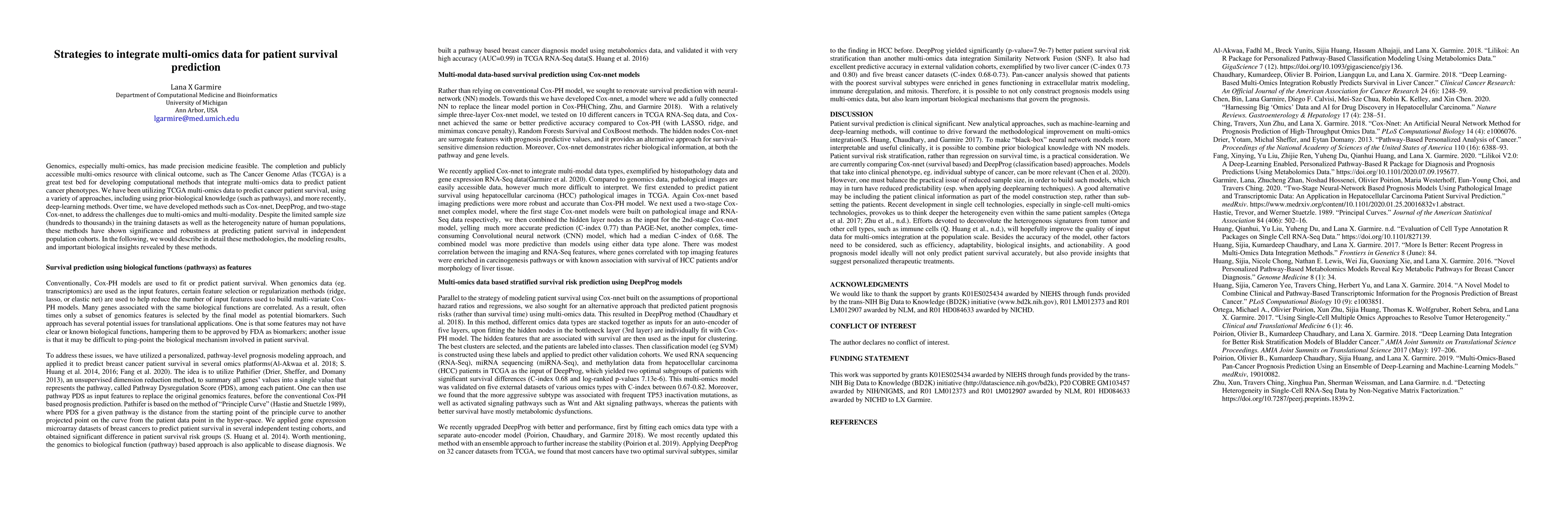 Genomics, especially multi-omics, has made precision medicine feasible. The completion and publicly accessible multi-omics resource with clinical outcome, such as The Cancer Genome Atlas (TCGA) is a great test bed for developing computational methods that integrate multi-omics data to predict patient cancer phenotypes. We have been utilizing TCGA multi-omics data to predict cancer patient survival, using a variety of approaches, including prior-biological knowledge (such as pathways), and more recently, deep-learning methods. Over time, we have developed methods such as Cox-nnet, DeepProg, and two-stage Cox-nnet, to address the challenges due to multi-omics and multi-modality. Despite the limited sample size (hundreds to thousands) in the training datasets as well as the heterogeneity nature of human populations, these methods have shown significance and robustness at predicting patient survival in independent population cohorts. In the following, we would describe in detail these methodologies, the modeling results, and important biological insights revealed by these methods.