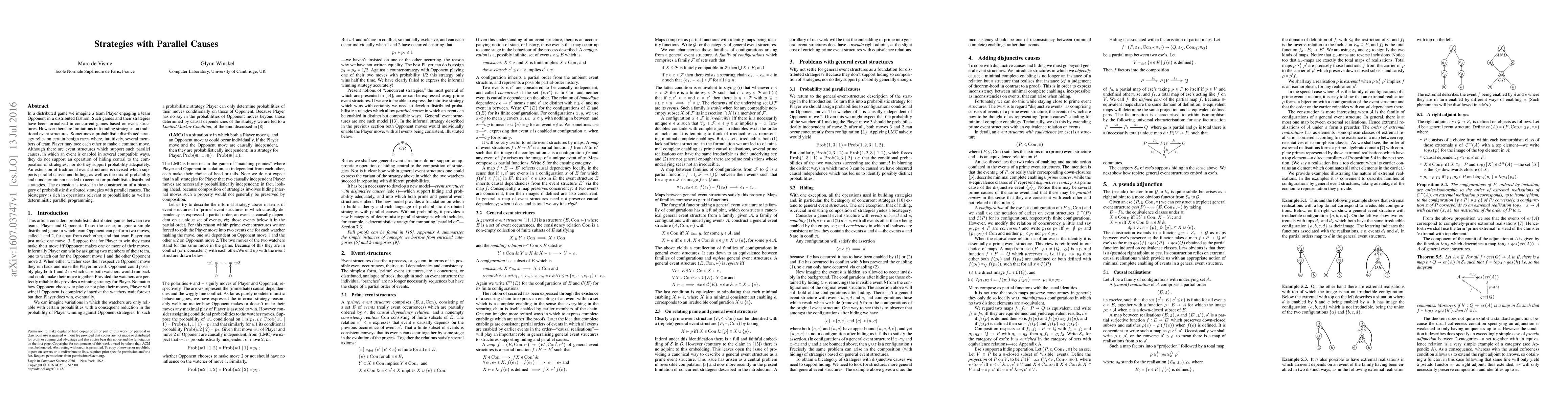 In a distributed game we imagine a team Player engaging a team Opponent in a distributed fashion. Such games and their strategies have been formalised in concurrent games based on event structures. However there are limitations in founding strategies on traditional event structures. Sometimes a probabilistic distributed strategy relies on certain benign races where, intuitively, several members of team Player may race each other to make a common move. Although there are event structures which support such parallel causes, in which an event is enabled in several compatible ways, they do not support an operation of hiding central to the composition of strategies; nor do they support probability adequately. An extension of traditional event structures is devised which supports parallel causes and hiding, as well as the mix of probability and nondeterminism needed to account for probabilistic distributed strategies. The extension is tested in the construction of a bicategory of probabilistic distributed strategies with parallel causes. The bicategory is rich in operations relevant to probabilistic as well as deterministic parallel programming.