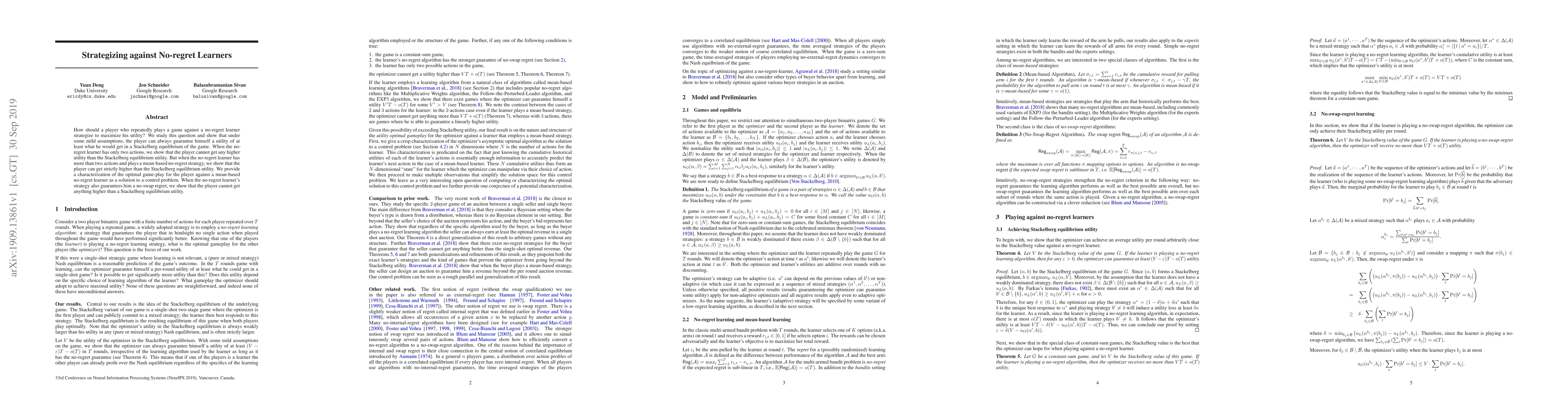 This paper explores strategies for a player competing against a no-regret learner in repeated games, demonstrating that under certain conditions, the player can achieve utility at least as high as in a Stackelberg equilibrium. It reveals that when the no-regret learner has more than two actions, the player can exceed Stackelberg equilibrium utility, while no-swap regret limits the player to such equilibrium utility.