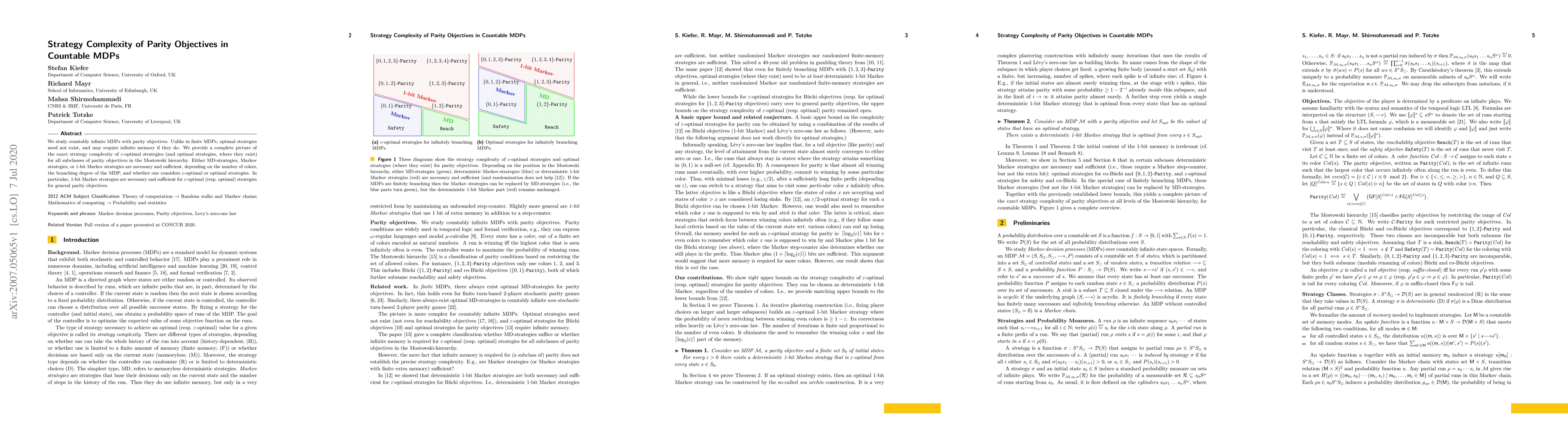 We study countably infinite MDPs with parity objectives. Unlike in finite MDPs, optimal strategies need not exist, and may require infinite memory if they do. We provide a complete picture of the exact strategy complexity of $\varepsilon$-optimal strategies (and optimal strategies, where they exist) for all subclasses of parity objectives in the Mostowski hierarchy. Either MD-strategies, Markov strategies, or 1-bit Markov strategies are necessary and sufficient, depending on the number of colors, the branching degree of the MDP, and whether one considers $\varepsilon$-optimal or optimal strategies. In particular, 1-bit Markov strategies are necessary and sufficient for $\varepsilon$-optimal (resp. optimal) strategies for general parity objectives.