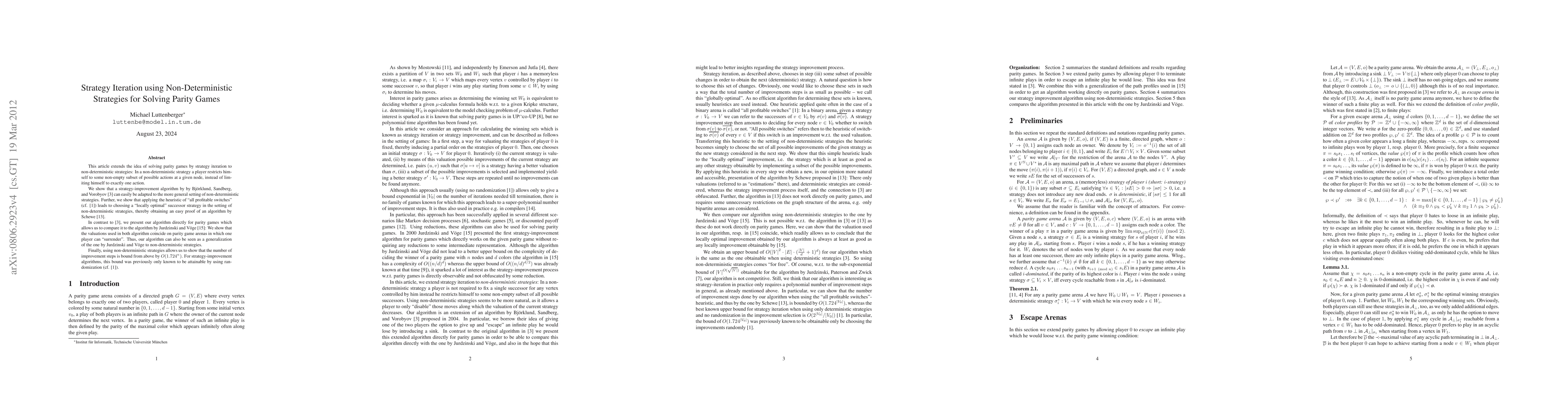 This paper adapts the strategy iteration method for solving parity games to non-deterministic strategies, demonstrating that the "all profitable switches" heuristic leads to locally optimal choices. It generalizes previous algorithms and shows that the number of improvement steps is bounded by O(1.724^n).