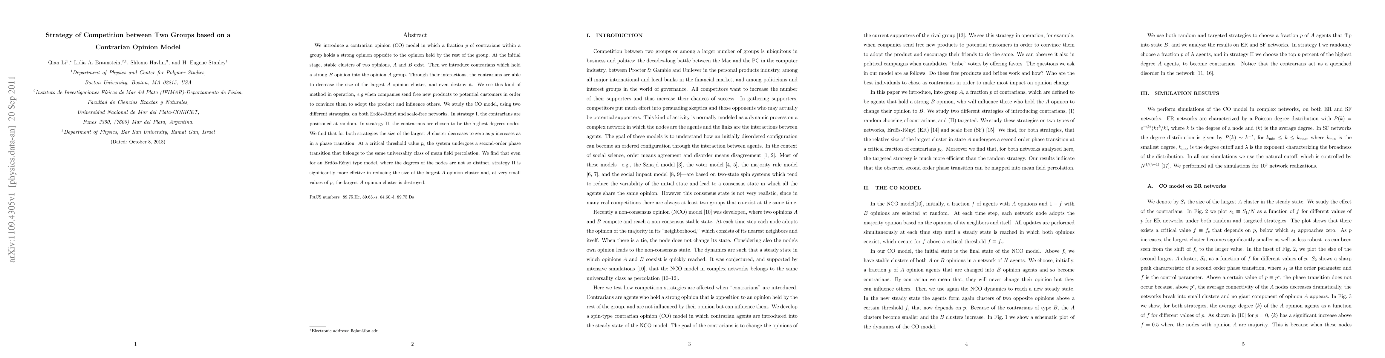We introduce a contrarian opinion (CO) model in which a fraction p of contrarians within a group holds a strong opinion opposite to the opinion held by the rest of the group. At the initial stage, stable clusters of two opinions, A and B exist. Then we introduce contrarians which hold a strong B opinion into the opinion A group. Through their interactions, the contrarians are able to decrease the size of the largest A opinion cluster, and even destroy it. We see this kind of method in operation, e.g when companies send free new products to potential customers in order to convince them to adopt the product and influence others. We study the CO model, using two different strategies, on both ER and scale-free networks. In strategy I, the contrarians are positioned at random. In strategy II, the contrarians are chosen to be the highest degrees nodes. We find that for both strategies the size of the largest A cluster decreases to zero as p increases as in a phase transition. At a critical threshold value p_c the system undergoes a second-order phase transition that belongs to the same universality class of mean field percolation. We find that even for an ER type model, where the degrees of the nodes are not so distinct, strategy II is significantly more effctive in reducing the size of the largest A opinion cluster and, at very small values of p, the largest A opinion cluster is destroyed.