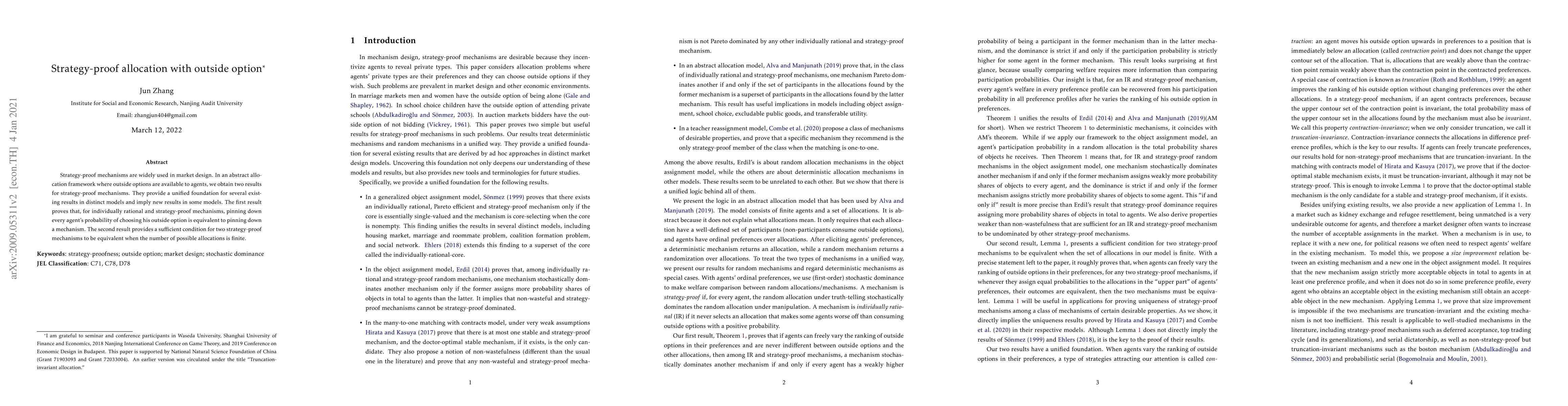 Strategy-proof mechanisms are widely used in market design. In an abstract allocation framework where outside options are available to agents, we obtain two results for strategy-proof mechanisms. They provide a unified foundation for several existing results in distinct models and imply new results in some models. The first result proves that, for individually rational and strategy-proof mechanisms, pinning down every agent's probability of choosing his outside option is equivalent to pinning down a mechanism. The second result provides a sufficient condition for two strategy-proof mechanisms to be equivalent when the number of possible allocations is finite.