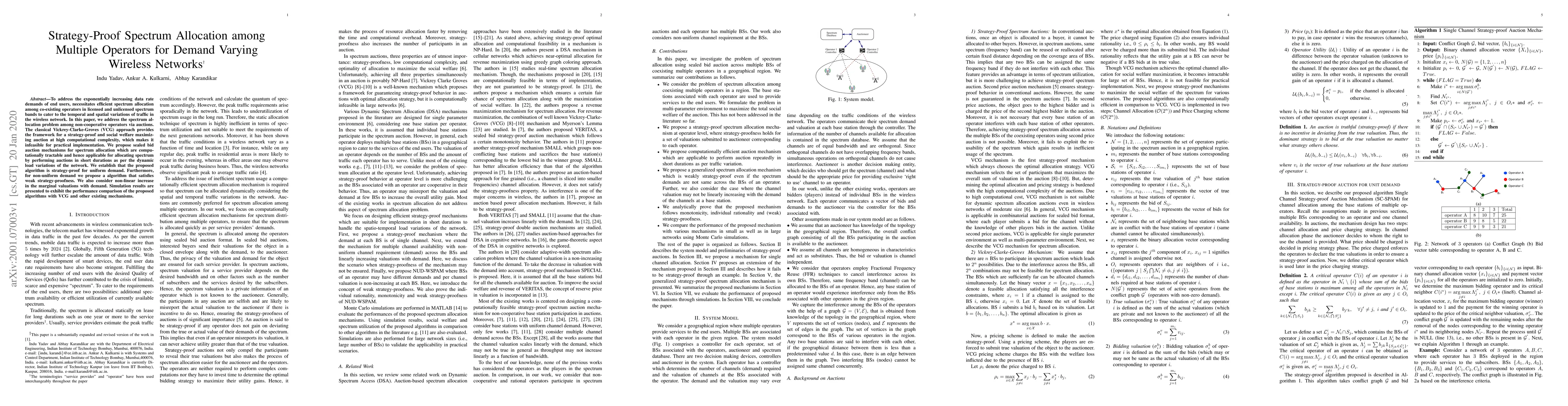 This paper proposes computationally efficient sealed bid auction mechanisms for dynamic spectrum allocation among multiple operators in wireless networks, addressing the challenge of varying user demand. The proposed algorithms are strategy-proof for uniform demand and weakly strategy-proof for non-uniform demand, offering practical alternatives to the high-complexity VCG approach.