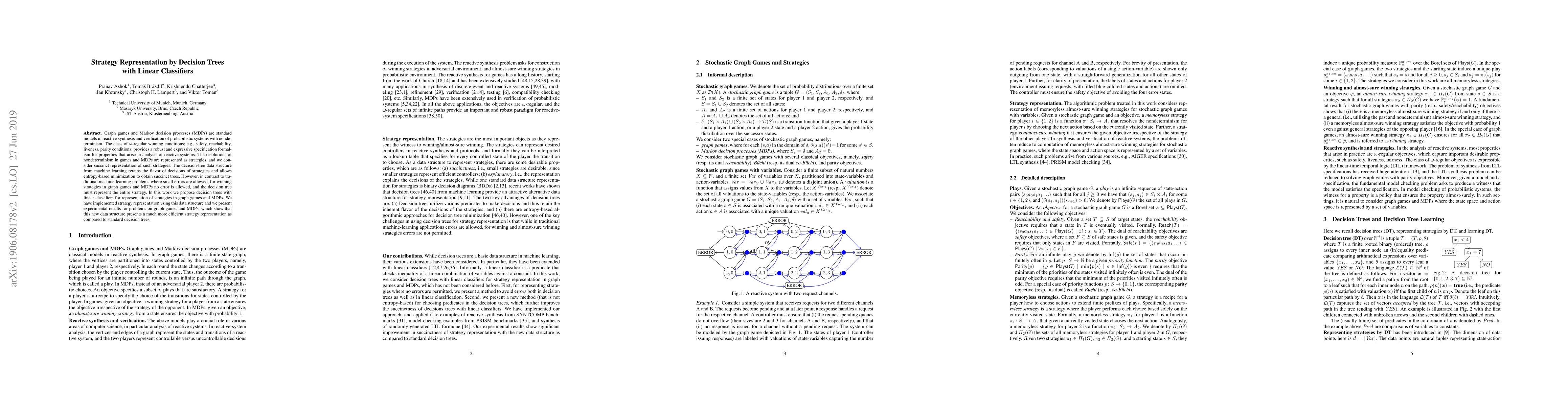 This paper proposes using decision trees with linear classifiers to succinctly represent strategies in graph games and Markov decision processes, achieving more efficient strategy representation compared to traditional decision trees. Experimental results demonstrate the effectiveness of this approach in handling winning strategies without errors.