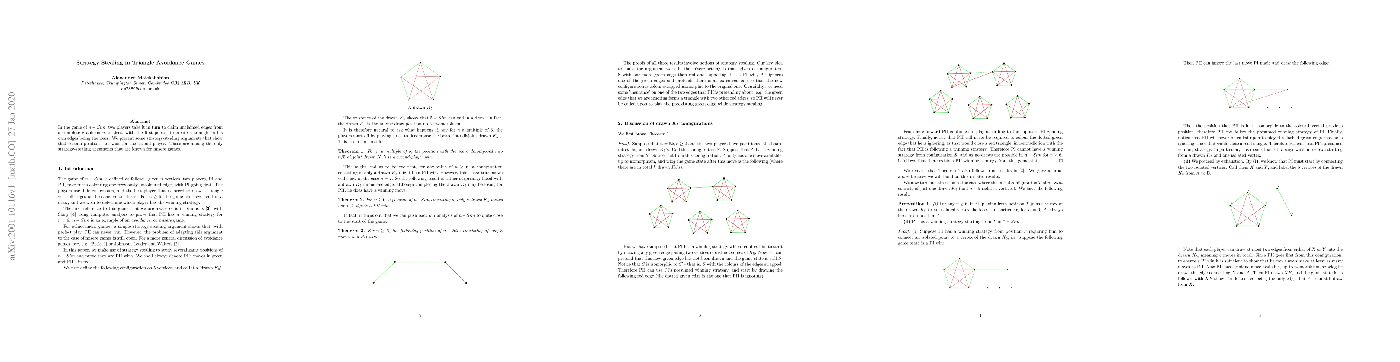 This paper explores the $n-Sim$ game where players claim edges to avoid forming triangles, and it presents strategy-stealing arguments proving that the second player can always force a win in specific positions, marking some of the few known strategy-stealing arguments for misère games.
