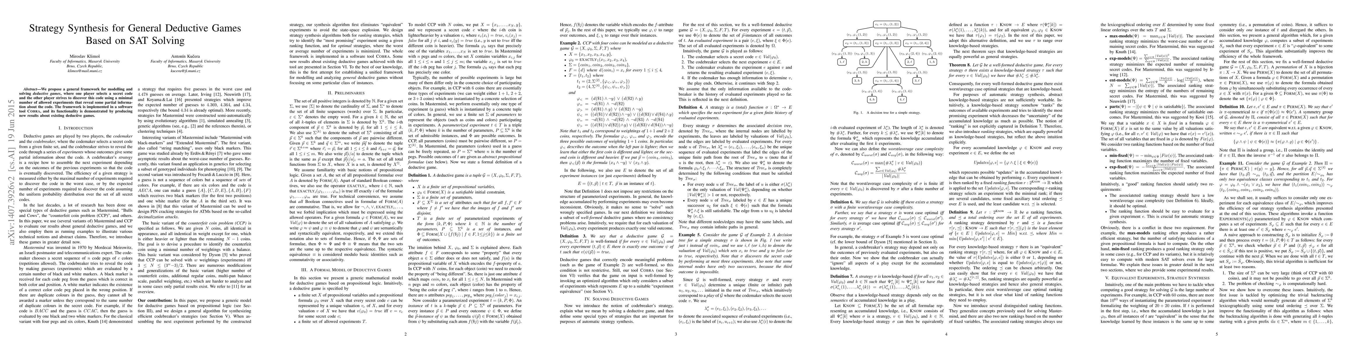 We propose a general framework for modelling and solving deductive games, where one player selects a secret code and the other player strives to discover this code using a minimal number of allowed experiments that reveal some partial information about the code. The framework is implemented in a software tool Cobra, and its functionality is demonstrated by producing new results about existing deductive games.
