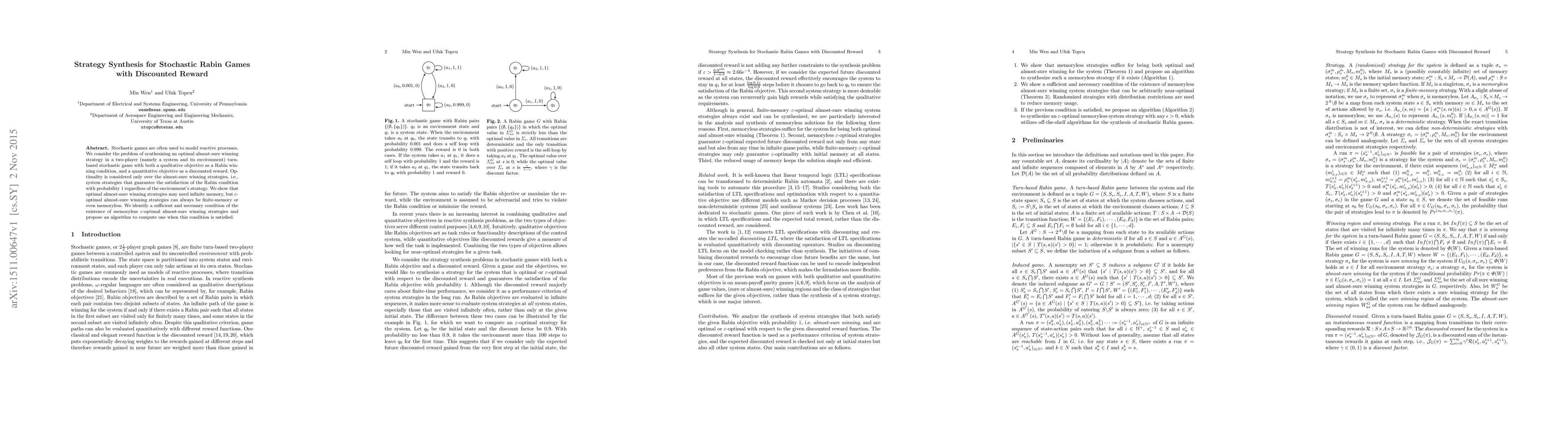This paper addresses the synthesis of optimal strategies for two-player stochastic Rabin games with discounted rewards, focusing on almost-sure winning conditions. It demonstrates that while optimal strategies may require infinite memory, epsilon-optimal strategies can be finite-memory or memoryless, proposing an algorithm to find such strategies when a specific condition is met.