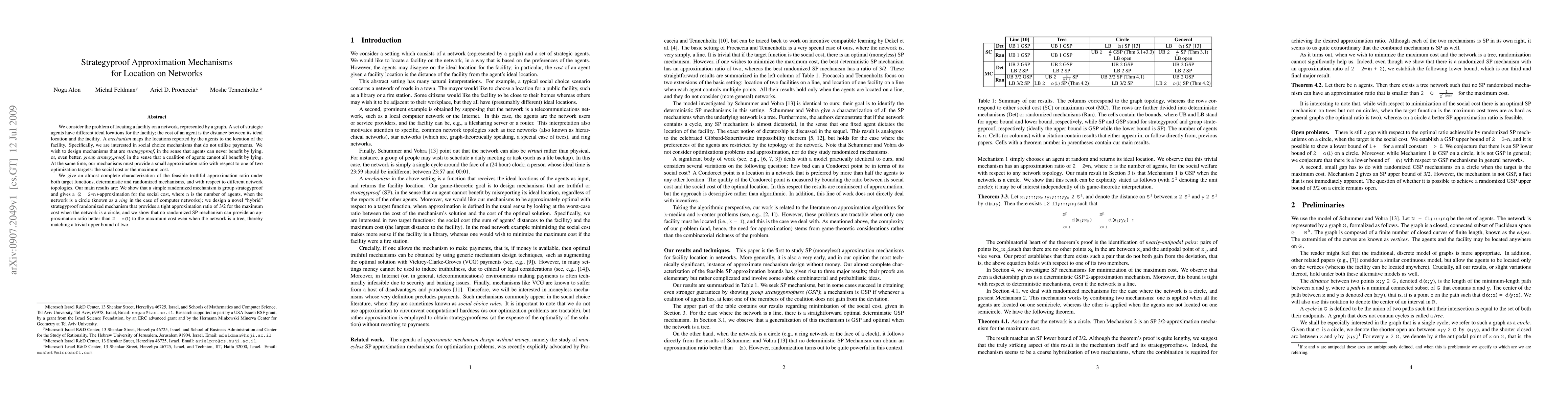 We consider the problem of locating a facility on a network, represented by a graph. A set of strategic agents have different ideal locations for the facility; the cost of an agent is the distance between its ideal location and the facility. A mechanism maps the locations reported by the agents to the location of the facility. Specifically, we are interested in social choice mechanisms that do not utilize payments. We wish to design mechanisms that are strategyproof, in the sense that agents can never benefit by lying, or, even better, group strategyproof, in the sense that a coalition of agents cannot all benefit by lying. At the same time, our mechanisms must provide a small approximation ratio with respect to one of two optimization targets: the social cost or the maximum cost. We give an almost complete characterization of the feasible truthful approximation ratio under both target functions, deterministic and randomized mechanisms, and with respect to different network topologies. Our main results are: We show that a simple randomized mechanism is group strategyproof and gives a (2-2/n)-approximation for the social cost, where n is the number of agents, when the network is a circle (known as a ring in the case of computer networks); we design a novel "hybrid" strategyproof randomized mechanism that provides a tight approximation ratio of 3/2 for the maximum cost when the network is a circle; and we show that no randomized SP mechanism can provide an approximation ratio better than 2-o(1) to the maximum cost even when the network is a tree, thereby matching a trivial upper bound of two.