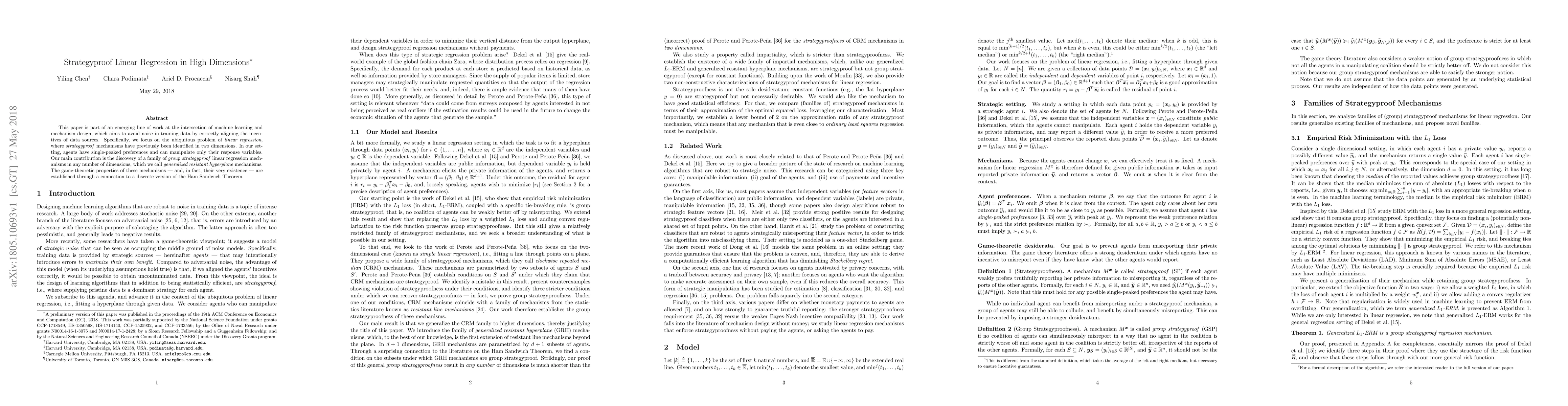 This paper develops strategyproof mechanisms for linear regression in high dimensions, addressing data manipulation through incentive alignment. It introduces generalized resistant hyperplane mechanisms, proving their properties via a connection to the Ham Sandwich Theorem.