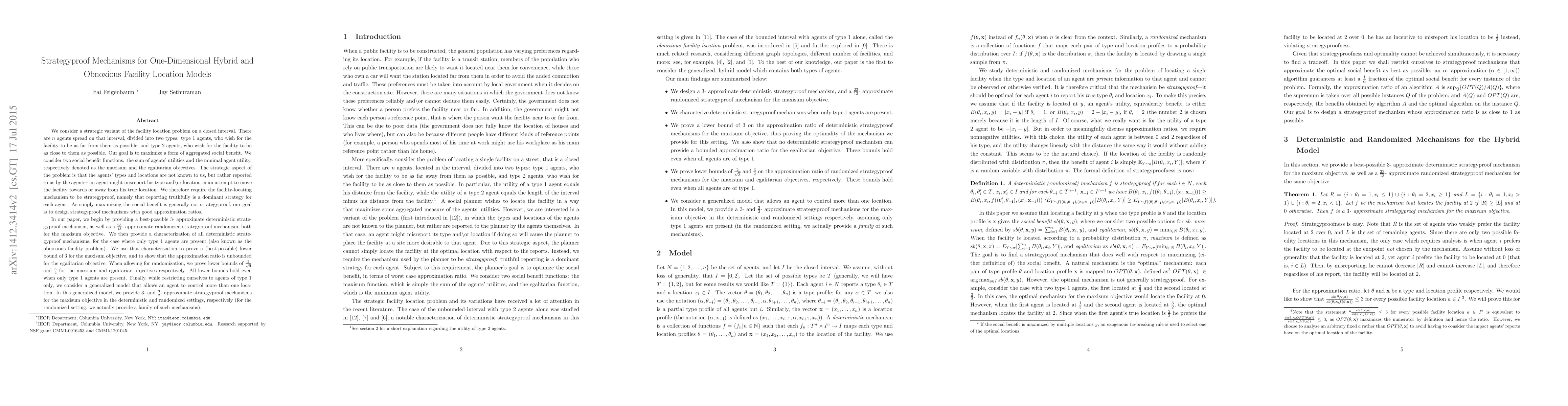 We consider a strategic variant of the facility location problem. We would like to locate a facility on a closed interval. There are n agents located on that interval, divided into two types: type 1 agents, who wish for the facility to be as far from them as possible, and type 2 agents, who wish for the facility to be as close to them as possible. Our goal is to maximize a form of aggregated social benefit: maxisum- the sum of the agents' utilities, or the egalitarian objective- the minimal agent utility. The strategic aspect of the problem is that the agents' locations are not known to us, but rather reported to us by the agents- an agent might misreport his location in an attempt to move the facility away from or towards to his true location. We therefore require the facility-locating mechanism to be strategyproof, namely that reporting truthfully is a dominant strategy for each agent. As simply maximizing the social benefit is generally not strategyproof, our goal is to design strategyproof mechanisms with good approximation ratios. For the maxisum objective, in the deterministic setting, we provide a best-possible 3- approximate strategyproof mechanism; in the randomized setting, we provide a 23/13- approximate strategyproof mechanism and a lower bound of \frac{2}{\sqrt{3}}. For the egalitarian objective, we provide a lower bound of 3/2 in the randomized setting, and show that no bounded approximation ratio is attainable in the deterministic setting. To obtain our deterministic lower bounds, we characterize all deterministic strategyproof mechanisms when all agents are of type 1. Finally, we consider a generalized model that allows an agent to control more than one location, and provide best-possible 3- and 3/2- approximate strategyproof mechanisms for maxisum, in the deterministic and randomized settings respectively, when only type 1 agents are present.