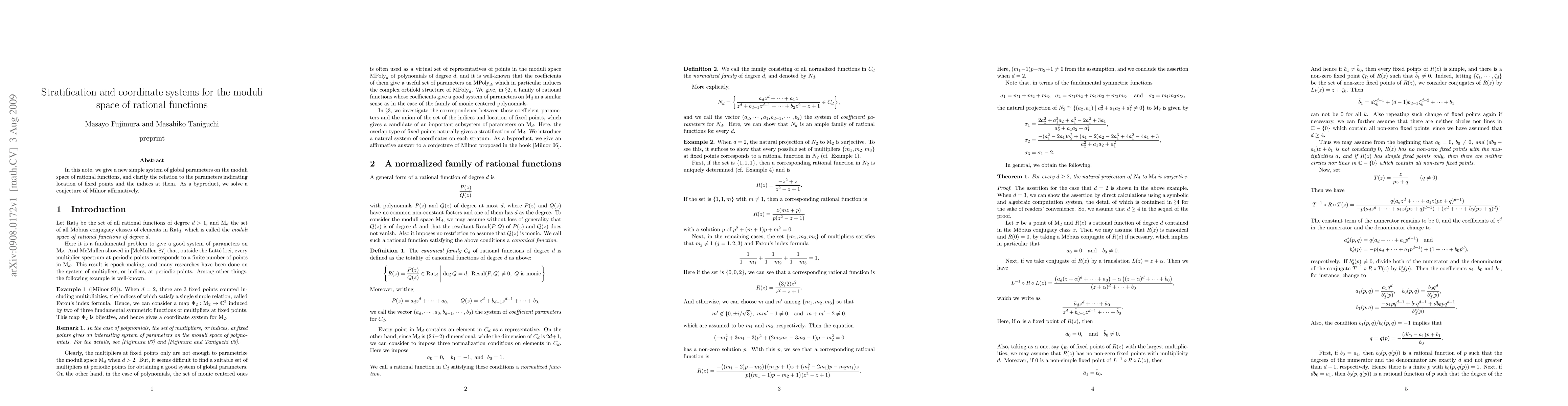 In this note, we give a new simple system of global parameters on the moduli space of rational functions, and clarify the relation to the parameters indicating location of fixed points and the indices at them. As a byproduct, we solve a conjecture of Milnor affirmatively.