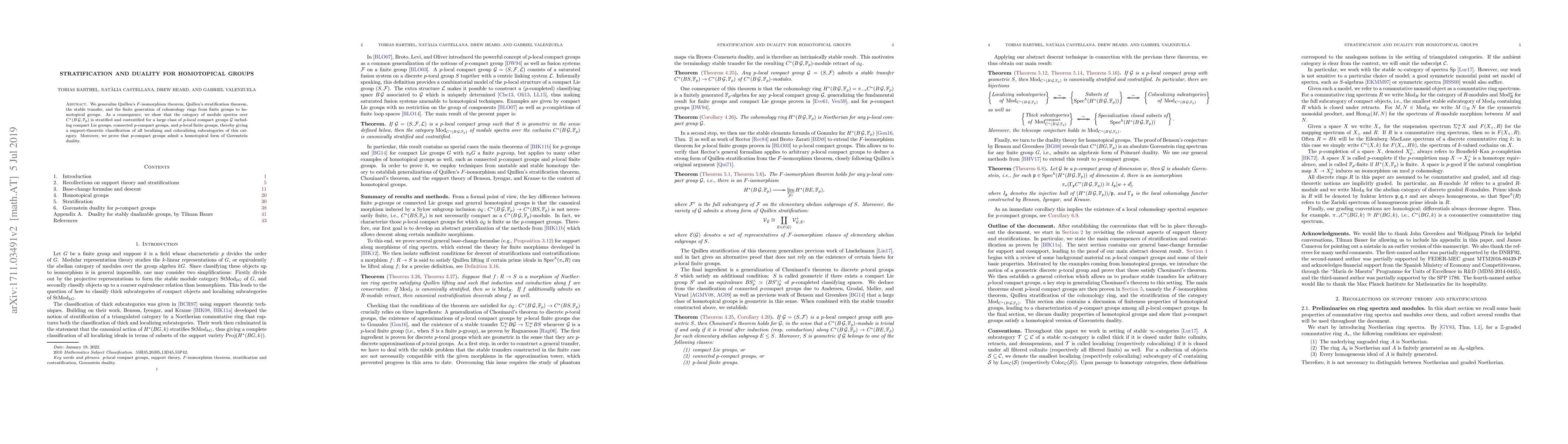 We generalize Quillen's $F$-isomorphism theorem, Quillen's stratification theorem, the stable transfer, and the finite generation of cohomology rings from finite groups to homotopical groups. As a consequence, we show that the category of module spectra over $C^*(B\mathcal{G},\mathbb{F}_p)$ is stratified and costratified for a large class of $p$-local compact groups $\mathcal{G}$ including compact Lie groups, connected $p$-compact groups, and $p$-local finite groups, thereby giving a support-theoretic classification of all localizing and colocalizing subcategories of this category. Moreover, we prove that $p$-compact groups admit a homotopical form of Gorenstein duality.