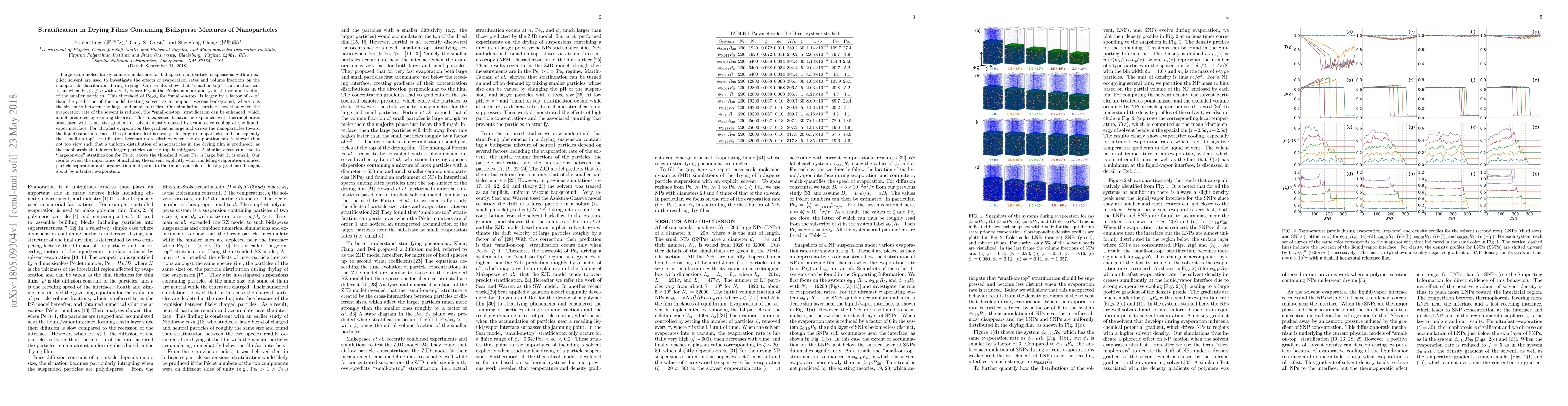This paper uses molecular dynamics simulations to explore nanoparticle stratification in drying films of bidisperse mixtures, finding that "small-on-top" stratification occurs when evaporation rates and volume fractions meet specific conditions. The study reveals that thermophoresis driven by evaporative cooling enhances this stratification, especially for slower evaporation rates.