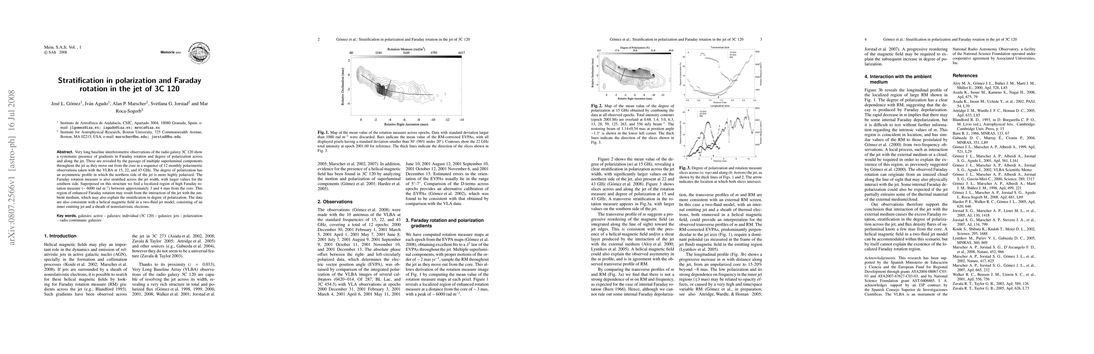 This study uses VLBA observations to reveal gradients in Faraday rotation and polarization across and along the jet of 3C 120, indicating a stratified structure possibly due to jet-medium interaction. The northern jet side shows higher polarization, while the southern side has higher Faraday rotation, suggesting a helical magnetic field in a two-fluid jet model.