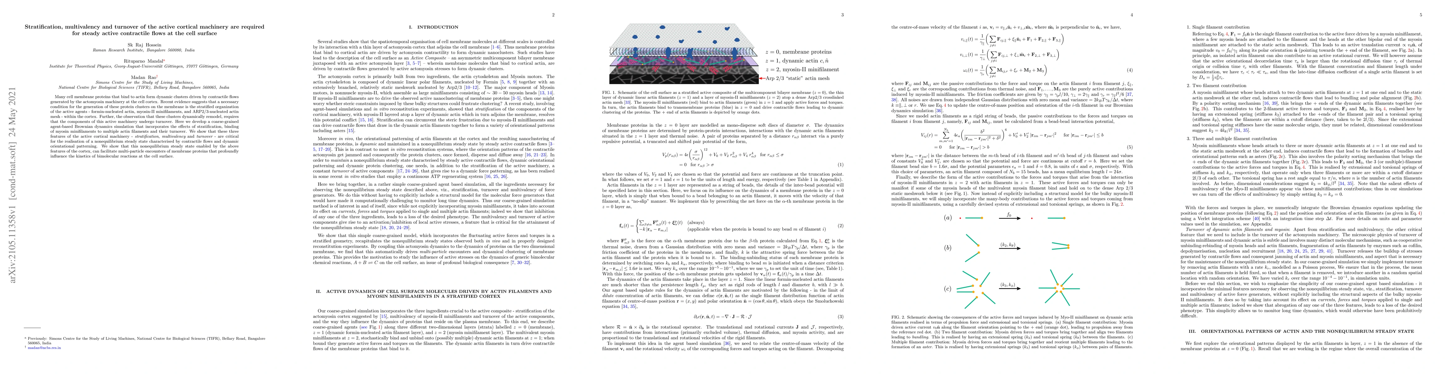 This paper develops a simulation to model the stratified organization, multivalency, and turnover of active cortical machinery, demonstrating that these features are essential for generating contractile flows and dynamic patterns at the cell surface, which in turn influence the kinetics of reactions at the cell membrane.