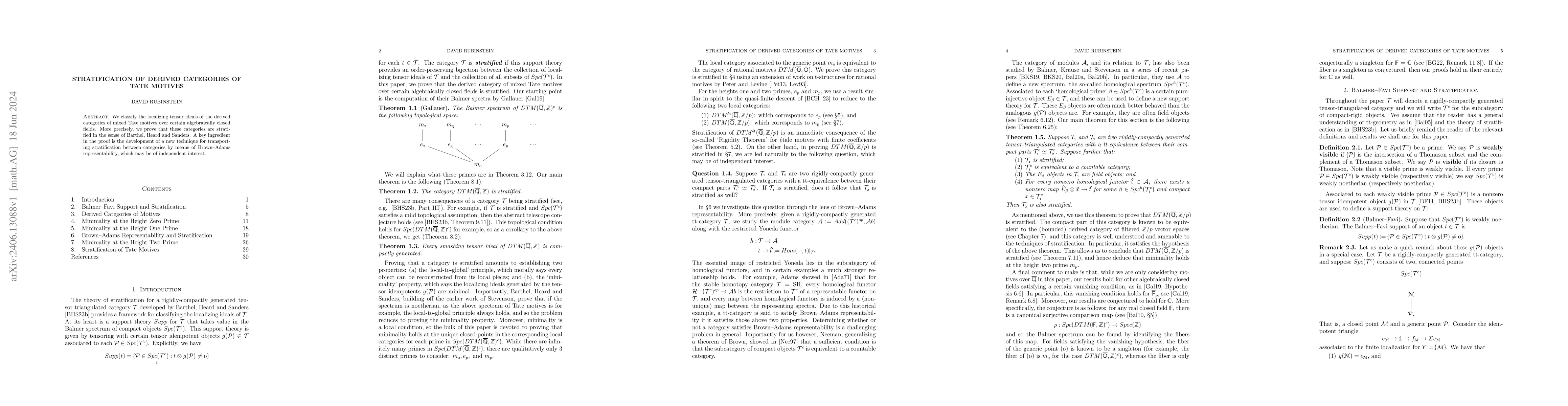 The paper classifies localizing tensor ideals in the derived categories of mixed Tate motives, demonstrating stratification using a novel technique involving Brown-Adams representability, which could have broader applications. This method may stand on its own as an independent contribution.