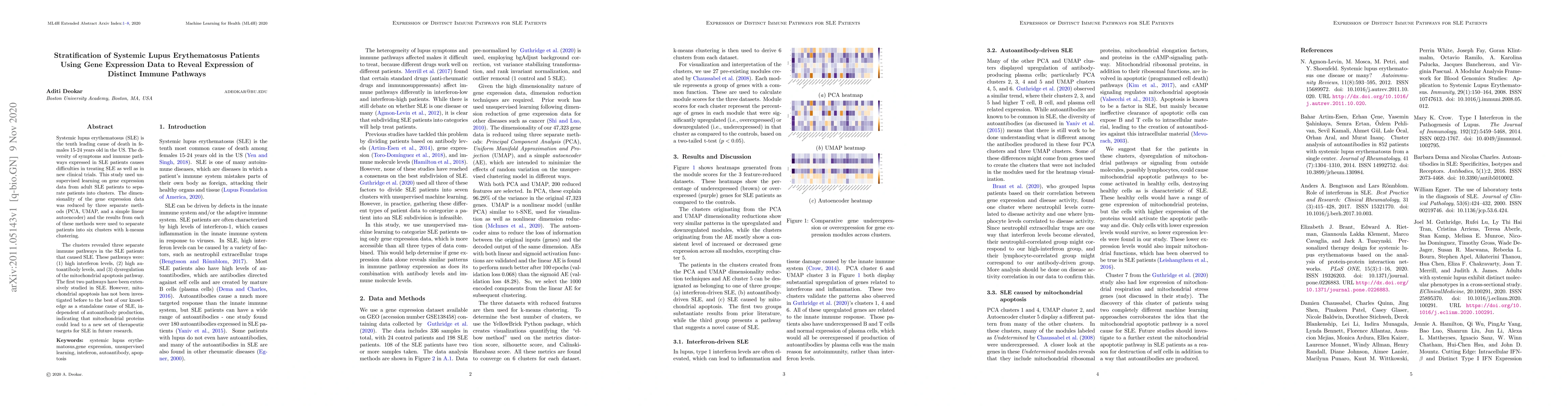Systemic lupus erythematosus (SLE) is the tenth leading cause of death in females 15-24 years old in the US. The diversity of symptoms and immune pathways expressed in SLE patients causes difficulties in treating SLE as well as in new clinical trials. This study used unsupervised learning on gene expression data from adult SLE patients to separate patients into clusters. The dimensionality of the gene expression data was reduced by three separate methods (PCA, UMAP, and a simple linear autoencoder) and the results from each of these methods were used to separate patients into six clusters with k-means clustering. The clusters revealed three separate immune pathways in the SLE patients that caused SLE. These pathways were: (1) high interferon levels, (2) high autoantibody levels, and (3) dysregulation of the mitochondrial apoptosis pathway. The first two pathways have been extensively studied in SLE. However, mitochondrial apoptosis has not been investigated before to the best of our knowledge as a standalone cause of SLE, independent of autoantibody production, indicating that mitochondrial proteins could lead to a new set of therapeutic targets for SLE in future research.