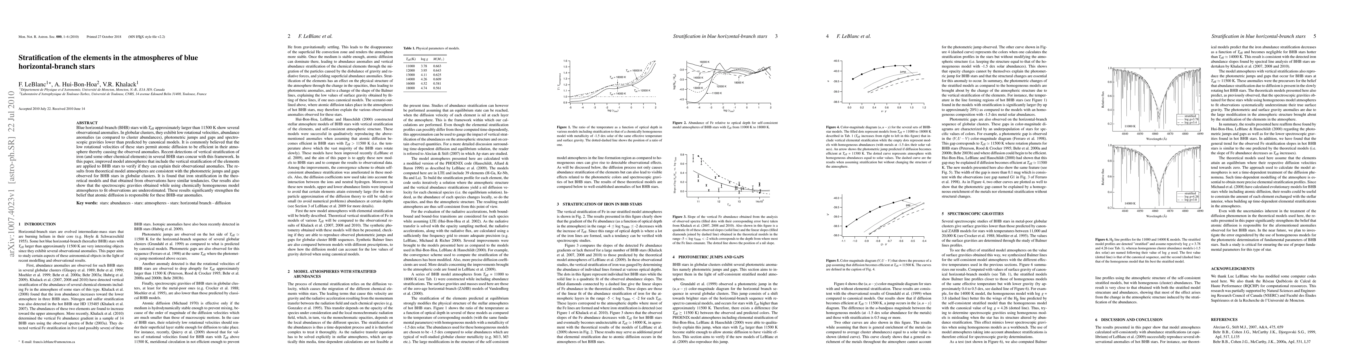 This paper investigates the stratification of elements in the atmospheres of blue horizontal-branch stars, finding that improved model atmospheres including vertical stratification can explain observed anomalies such as photometric jumps and gaps, supporting the theory that atomic diffusion is responsible for these phenomena.