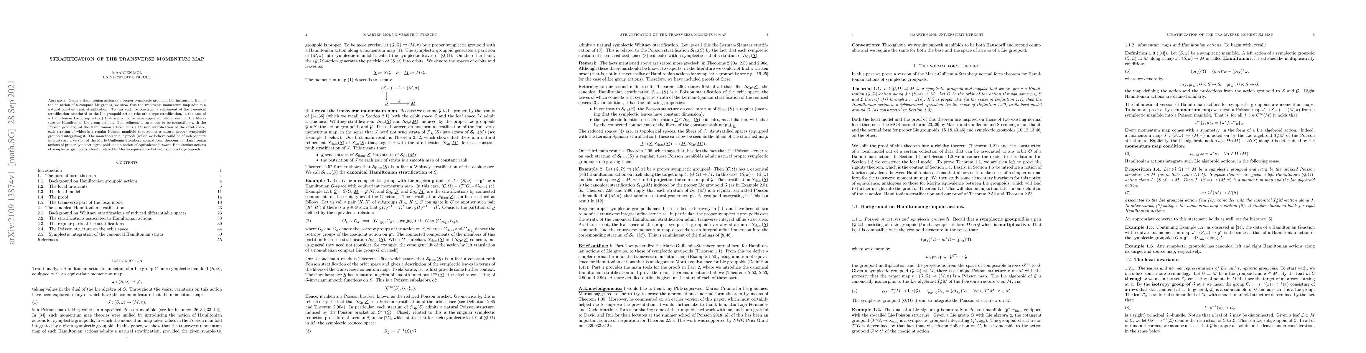Given a Hamiltonian action of a proper symplectic groupoid (for instance, a Hamiltonian action of a compact Lie group), we show that the transverse momentum map admits a natural constant rank stratification. To this end, we construct a refinement of the canonical stratification associated to the Lie groupoid action (the orbit type stratification, in the case of a Hamiltonian Lie group action) that seems not to have appeared before, even in the literature on Hamiltonian Lie group actions. This refinement turns out to be compatible with the Poisson geometry of the Hamiltonian action: it is a Poisson stratification of the orbit space, each stratum of which is a regular Poisson manifold that admits a natural proper symplectic groupoid integrating it. The main tools in our proofs (which we believe could be of independent interest) are a version of the Marle-Guillemin-Sternberg normal form theorem for Hamiltonian actions of proper symplectic groupoids and a notion of equivalence between Hamiltonian actions of symplectic groupoids, closely related to Morita equivalence between symplectic groupoids.
