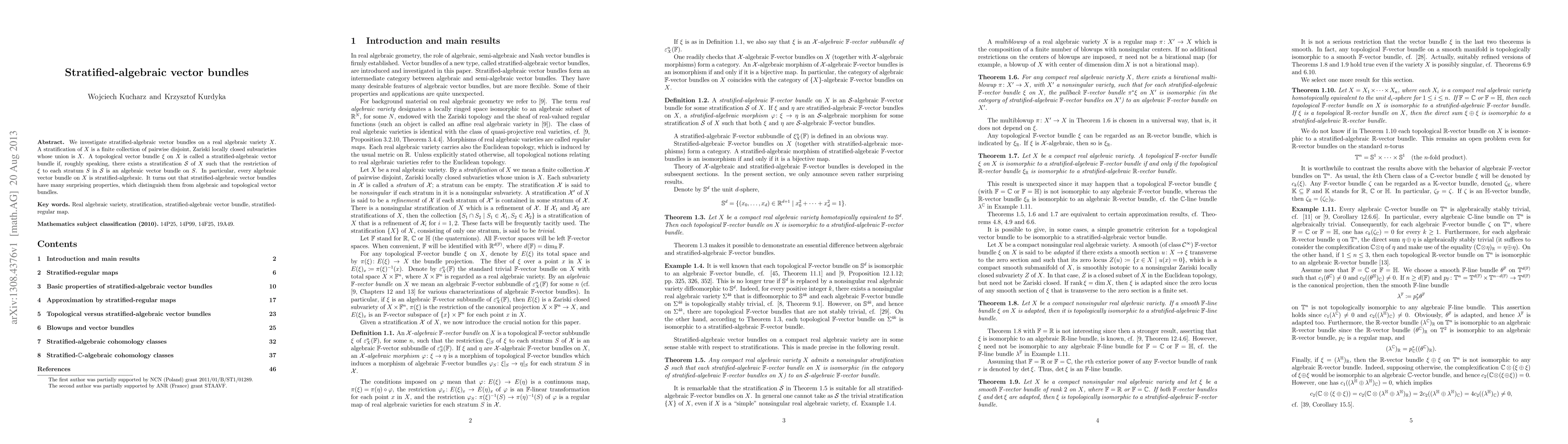 This paper explores stratified-algebraic vector bundles on real algebraic varieties, defined via stratifications where the bundle restricts to algebraic vector bundles on each stratum, yielding unique properties distinct from both algebraic and topological vector bundles.