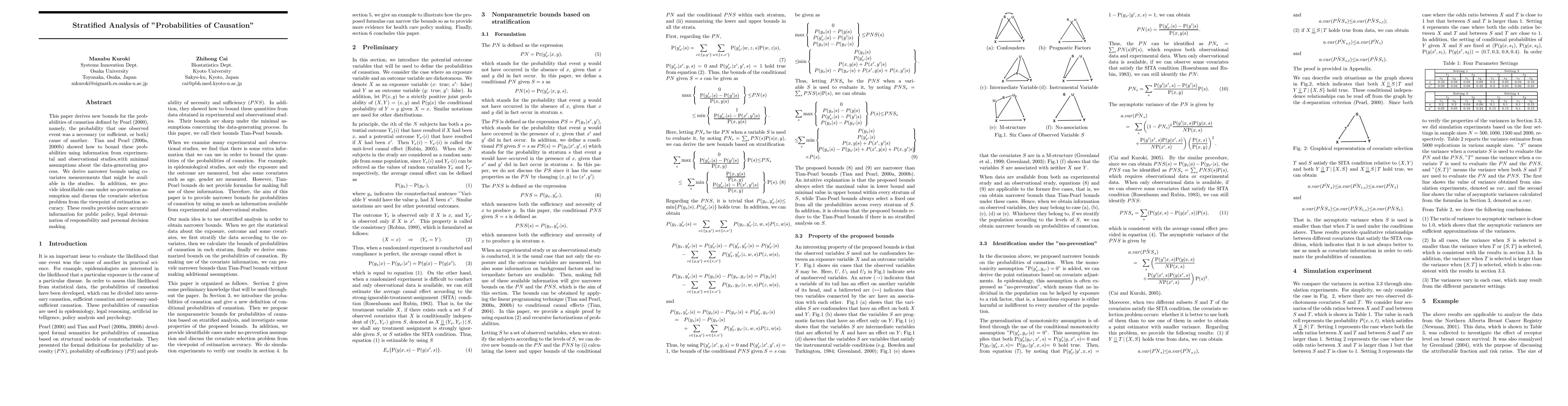 This paper proposes new formulas for the probabilities of causation difined by Pearl (2000). Tian and Pearl (2000a, 2000b) showed how to bound the quantities of the probabilities of causation from experimental and observational data, under the minimal assumptions about the data-generating process. We derive narrower bounds than Tian-Pearl bounds by making use of the covariate information measured in experimental and observational studies. In addition, we provide identifiable case under no-prevention assumption and discuss the covariate selection problem from the viewpoint of estimation accuracy. These results are helpful in providing more evidence for public policy assessment and dicision making problems.