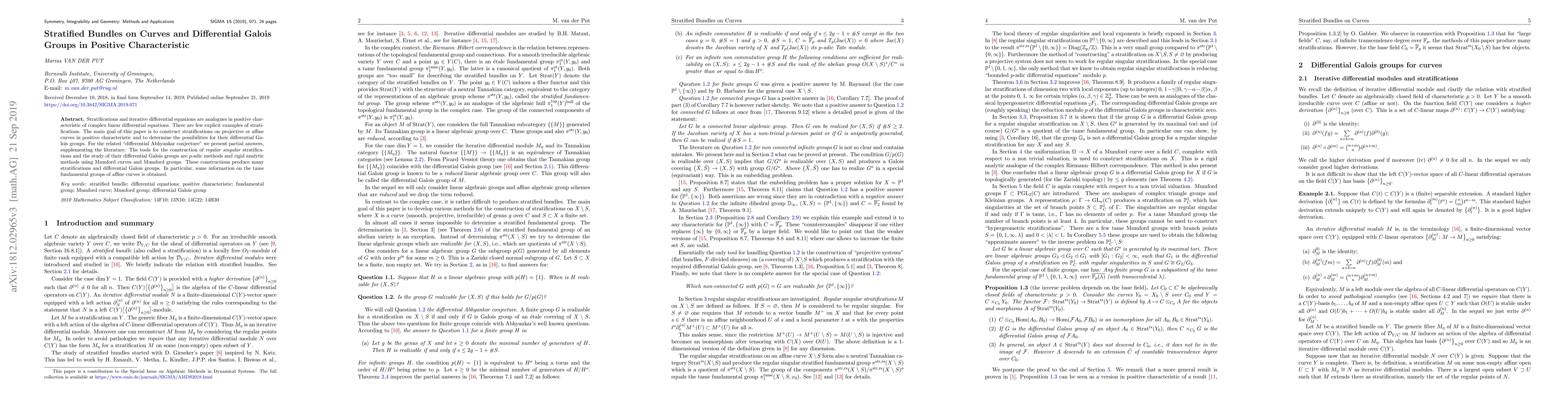 Stratifications and iterative differential equations are analogues in positive characteristic of complex linear differential equations. There are few explicit examples of stratifications. The main goal of this paper is to construct stratifications on projective or affine curves in positive characteristic and to determine the possibilities for their differential Galois groups. For the related "differential Abhyankar conjecture" we present partial answers, supplementing the literature. The tools for the construction of regular singular stratifications and the study of their differential Galois groups are $p$-adic methods and rigid analytic methods using Mumford curves and Mumford groups. These constructions produce many stratifications and differential Galois groups. In particular, some information on the tame fundamental groups of affine curves is obtained.