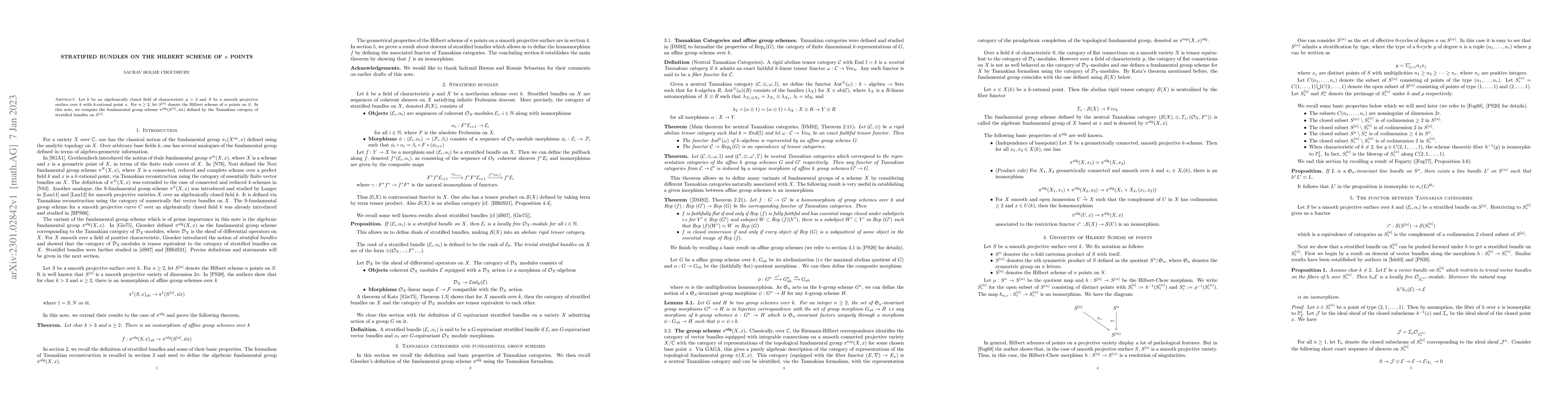 This paper computes the fundamental group scheme $\pi^{\textrm{alg}}(S^{[n]}, \tilde{nx})$ for the Hilbert scheme of $n$ points on a smooth projective surface $S$ over an algebraically closed field of characteristic $p > 3$, focusing on the Tannakian category of stratified bundles.