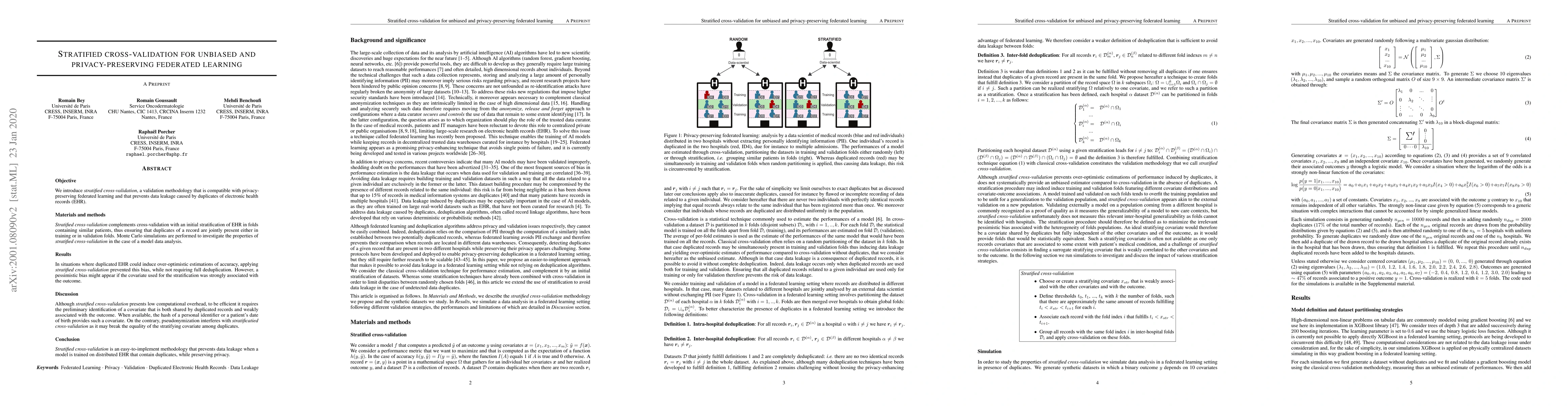 Large-scale collections of electronic records constitute both an opportunity for the development of more accurate prediction models and a threat for privacy. To limit privacy exposure new privacy-enhancing techniques are emerging such as federated learning which enables large-scale data analysis while avoiding the centralization of records in a unique database that would represent a critical point of failure. Although promising regarding privacy protection, federated learning prevents using some data-cleaning algorithms thus inducing new biases. In this work we focus on the recurrent problem of duplicated records that, if not handled properly, may cause over-optimistic estimations of a model's performances. We introduce and discuss stratified cross-validation, a validation methodology that leverages stratification techniques to prevent data leakage in federated learning settings without relying on demanding deduplication algorithms.