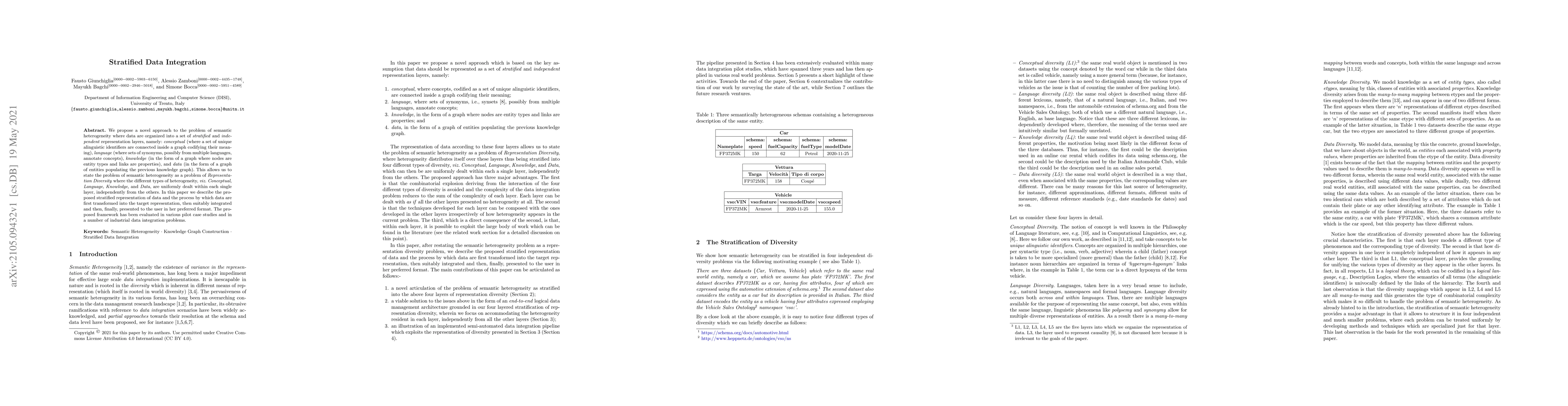 We propose a novel approach to the problem of semantic heterogeneity where data are organized into a set of stratified and independent representation layers, namely: conceptual(where a set of unique alinguistic identifiers are connected inside a graph codifying their meaning), language(where sets of synonyms, possibly from multiple languages, annotate concepts), knowledge(in the form of a graph where nodes are entity types and links are properties), and data(in the form of a graph of entities populating the previous knowledge graph). This allows us to state the problem of semantic heterogeneity as a problem of Representation Diversity where the different types of heterogeneity, viz. Conceptual, Language, Knowledge, and Data, are uniformly dealt within each single layer, independently from the others. In this paper we describe the proposed stratified representation of data and the process by which data are first transformed into the target representation, then suitably integrated and then, finally, presented to the user in her preferred format. The proposed framework has been evaluated in various pilot case studies and in a number of industrial data integration problems.