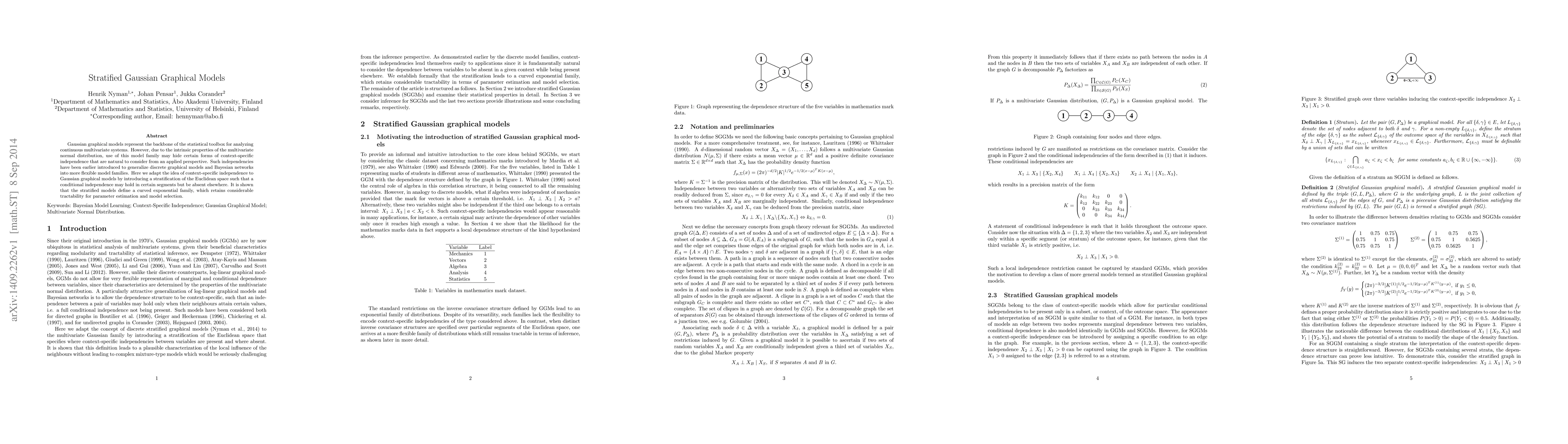 The research introduces stratified Gaussian graphical models (SGGMs) that adapt context-specific independence from discrete graphical models to Gaussian distributions, defining a curved exponential family for tractable parameter estimation and model selection.