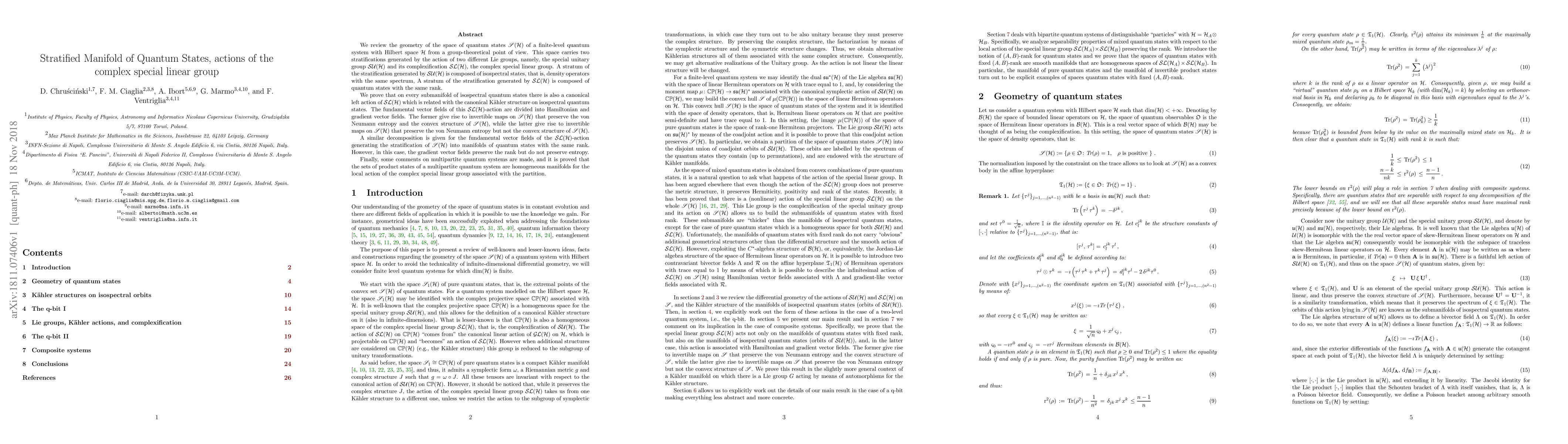 This paper explores the geometry of quantum states using group theory, showing that a finite-level system has two stratifications with different Lie groups, and finding actions and vector fields related to entropy and convexity preservation.