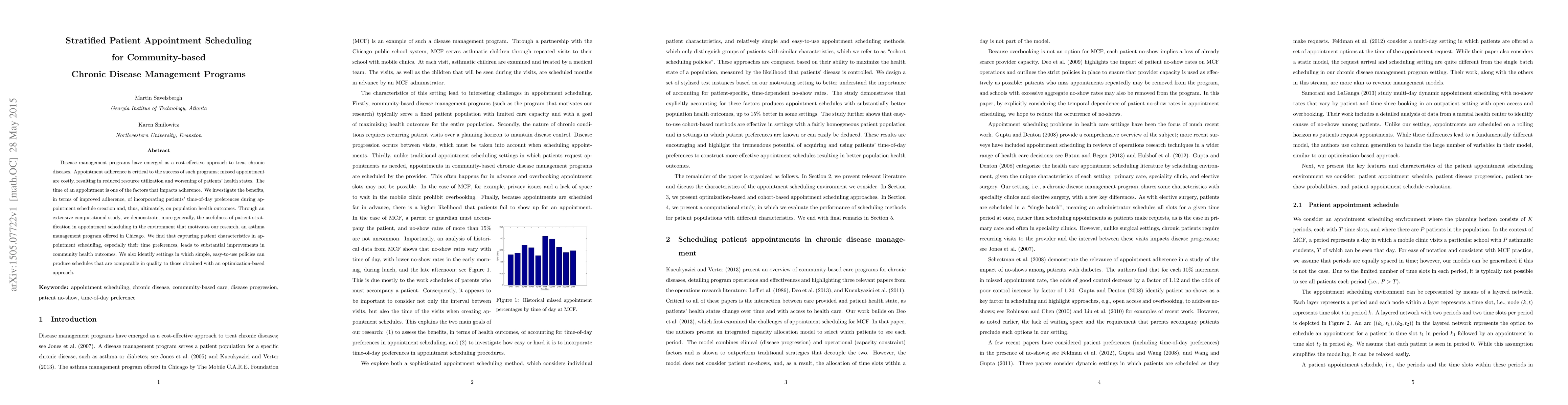 Disease management programs have emerged as a cost-effective approach to treat chronic diseases. Appointment adherence is critical to the success of such programs; missed appointment are costly, resulting in reduced resource utilization and worsening of patients' health states. The time of an appointment is one of the factors that impacts adherence. We investigate the benefits, in terms of improved adherence, of incorporating patients' time-of-day preferences during appointment schedule creation and, thus, ultimately, on population health outcomes. Through an extensive computational study, we demonstrate, more generally, the usefulness of patient stratification in appointment scheduling in the environment that motivates our research, an asthma management program offered in Chicago. We find that capturing patient characteristics in appointment scheduling, especially their time preferences, leads to substantial improvements in community health outcomes. We also identify settings in which simple, easy-to-use policies can produce schedules that are comparable in quality to those obtained with an optimization-based approach.