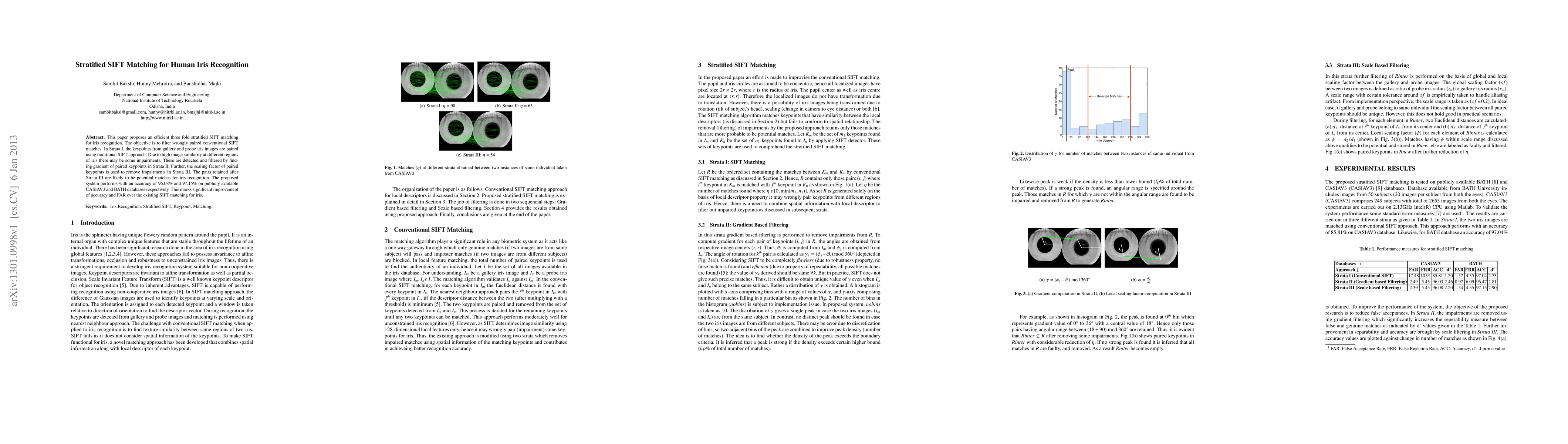 This paper introduces a stratified SIFT matching method for iris recognition, improving accuracy by filtering incorrect matches through three stages: traditional SIFT pairing, gradient-based filtering, and scaling factor refinement, achieving 96.08% and 97.15% accuracy on CASIAV3 and BATH databases respectively.