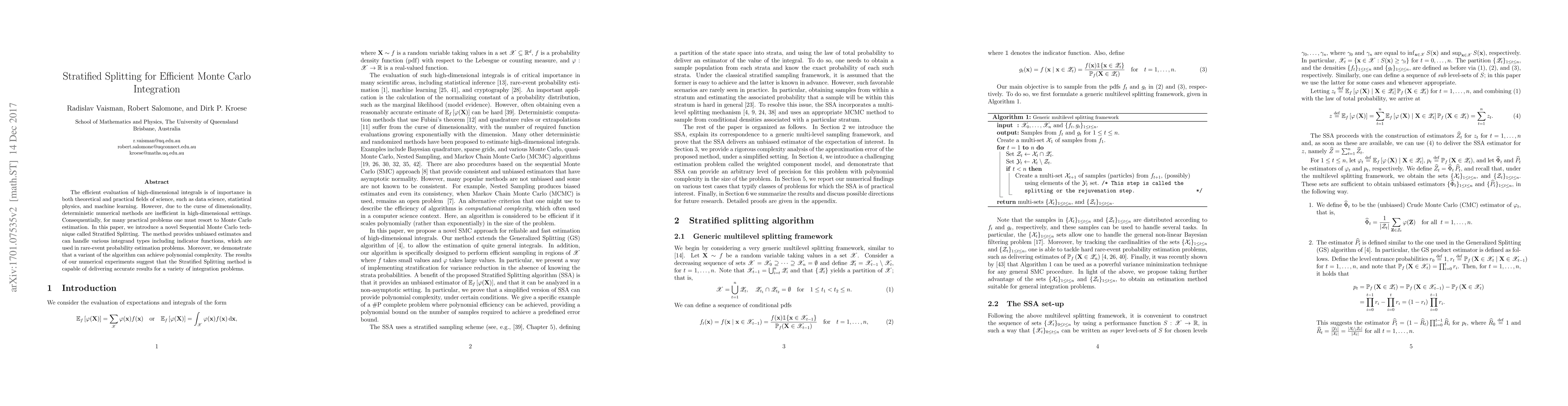 This paper presents Stratified Splitting, a novel Sequential Monte Carlo technique for efficient high-dimensional integration, offering unbiased estimates and polynomial complexity. Numerical experiments show its effectiveness in solving various integration problems, including those involving rare-event probability estimation.