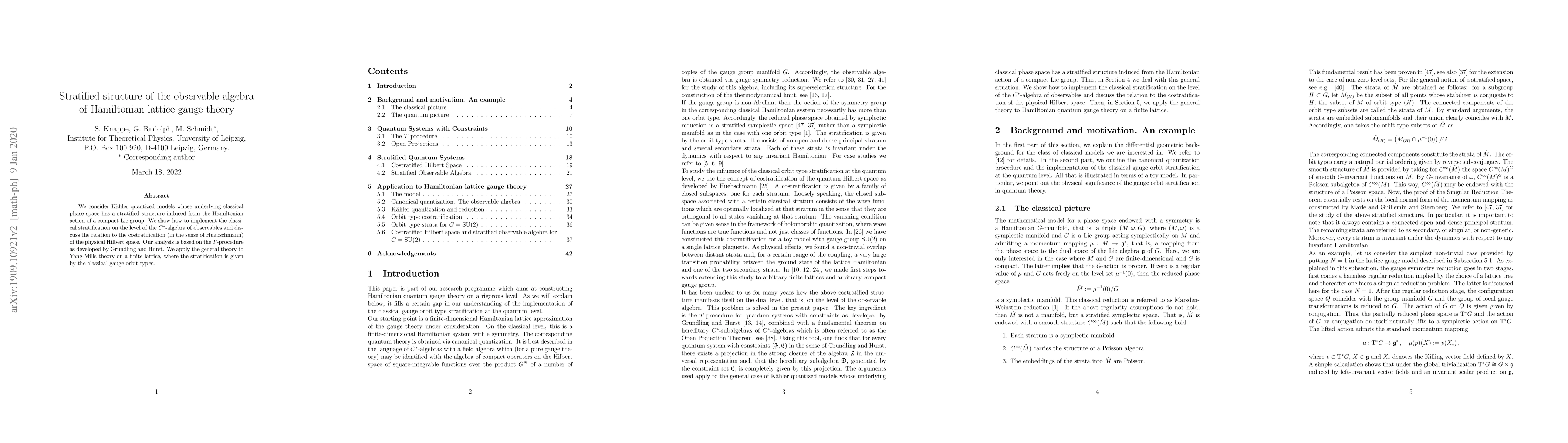 We consider Kaehler quantized models whose underlying classical phase space has a stratified structure induced from the Hamiltonian action of a compact Lie group. We show how to implement the classical stratification on the level of the C*-algebra of observables and discuss the relation to the costratification (in the sense of Huebschmann) of the physical Hilbert space. Our analysis is based on the T-procedure as developed by Grundling and Hurst. We apply the general theory to Yang-Mills theory on a finite lattice, where the stratification is given by the classical gauge orbit types.