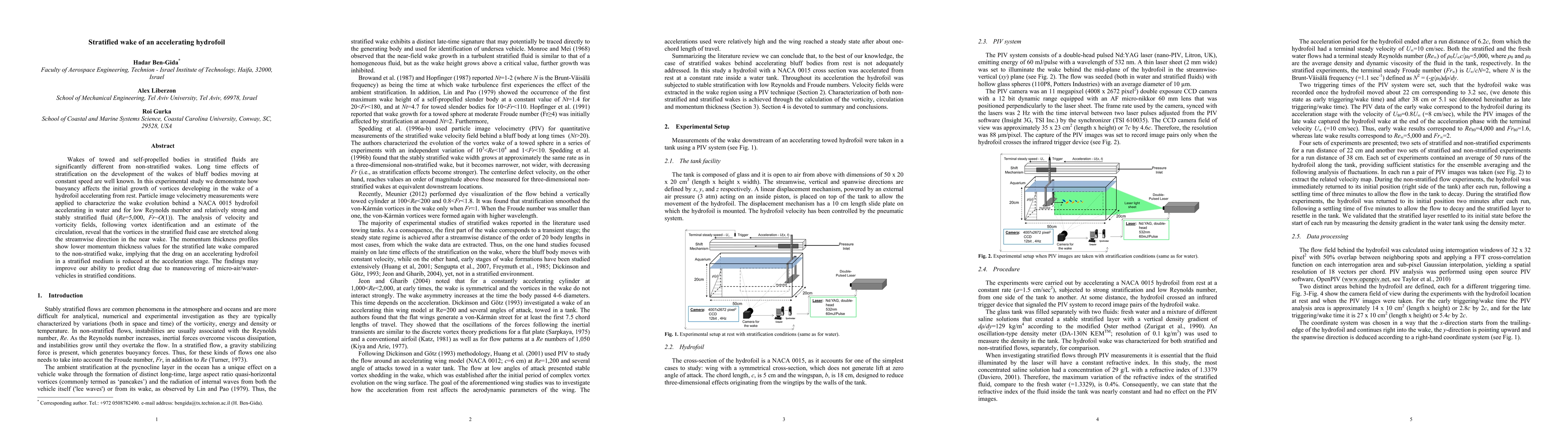 This study investigates how buoyancy influences the initial formation of vortices in the wake of an accelerating hydrofoil in a stably stratified fluid using particle image velocimetry. The results show that vortices are elongated along the streamwise direction in the near wake, leading to reduced drag during the acceleration phase in stratified conditions.