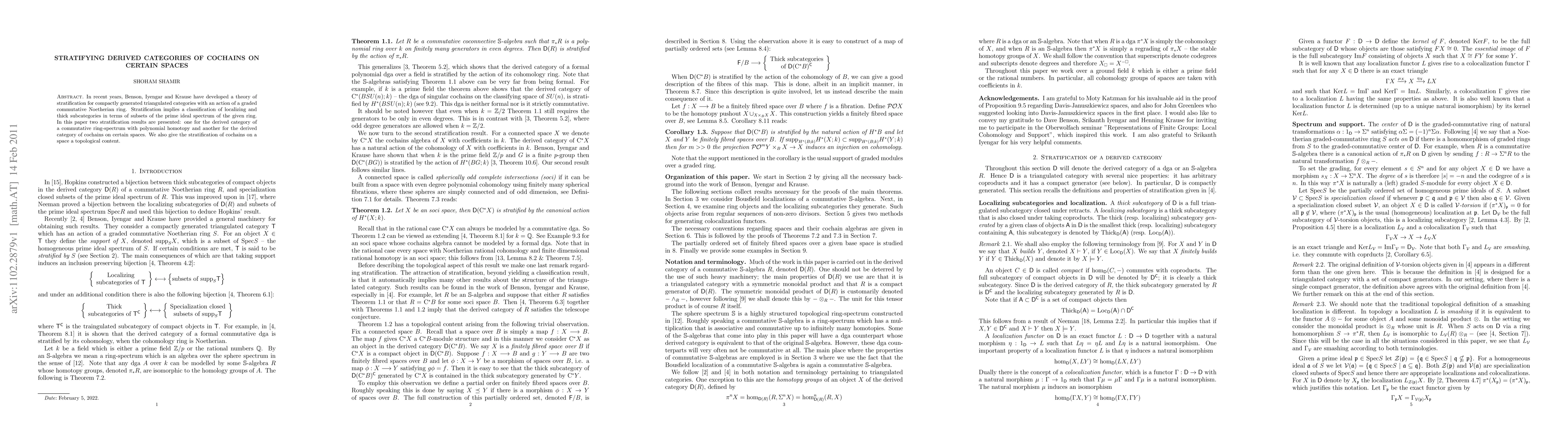 In recent years, Benson, Iyengar and Krause have developed a theory of stratification for compactly generated triangulated categories with an action of a graded commutative Noetherian ring. Stratification implies a classification of localizing and thick subcategories in terms of subsets of the prime ideal spectrum of the given ring. In this paper two stratification results are presented: one for the derived category of a commutative ring-spectrum with polynomial homotopy and another for the derived category of cochains on certain spaces. We also give the stratification of cochains on a space a topological content.