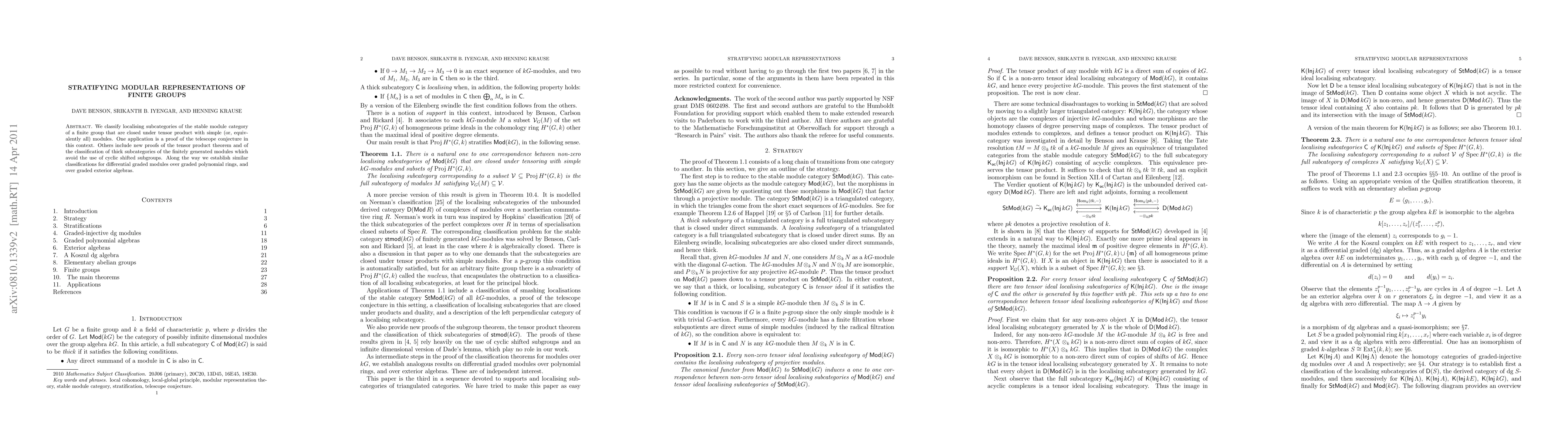 We classify localising subcategories of the stable module category of a finite group that are closed under tensor product with simple (or, equivalently all) modules. One application is a proof of the telescope conjecture in this context. Others include new proofs of the tensor product theorem and of the classification of thick subcategories of the finitely generated modules which avoid the use of cyclic shifted subgroups. Along the way we establish similar classifications for differential graded modules over graded polynomial rings, and over graded exterior algebras.