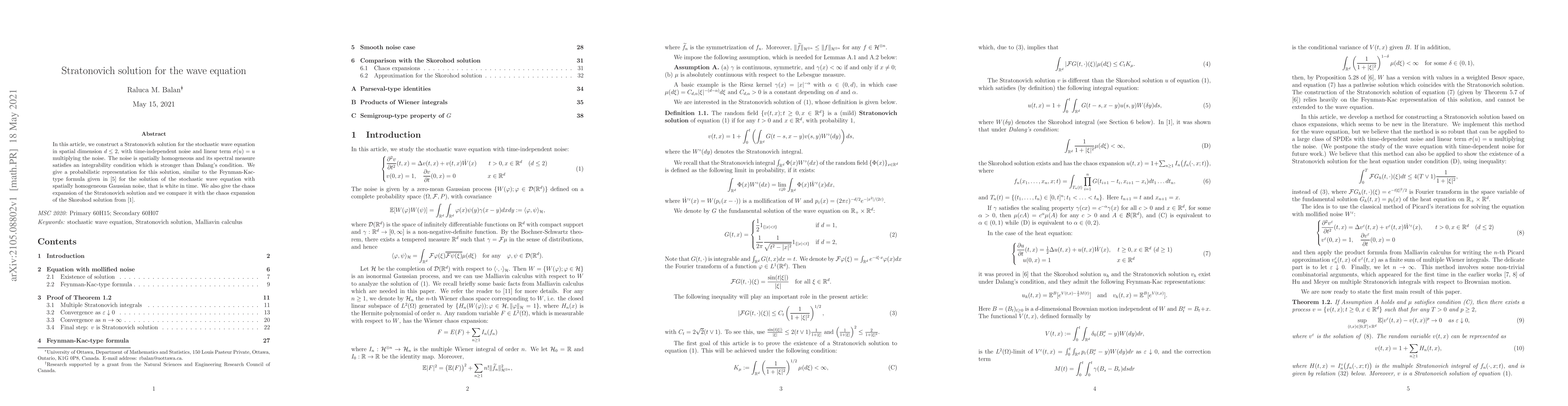 In this article, we construct a Stratonovich solution for the stochastic wave equation in spatial dimension $d \leq 2$, with time-independent noise and linear term $\sigma(u)=u$ multiplying the noise. The noise is spatially homogeneous and its spectral measure satisfies an integrability condition which is stronger than Dalang's condition. We give a probabilistic representation for this solution, similar to the Feynman-Kac-type formula given in Dalang, Mueller and Tribe (2008) for the solution of the stochastic wave equation with spatially homogeneous Gaussian noise, that is white in time. We also give the chaos expansion of the Stratonovich solution and we compare it with the chaos expansion of the Skorohod solution from Balan, Chen and Chen (2020).