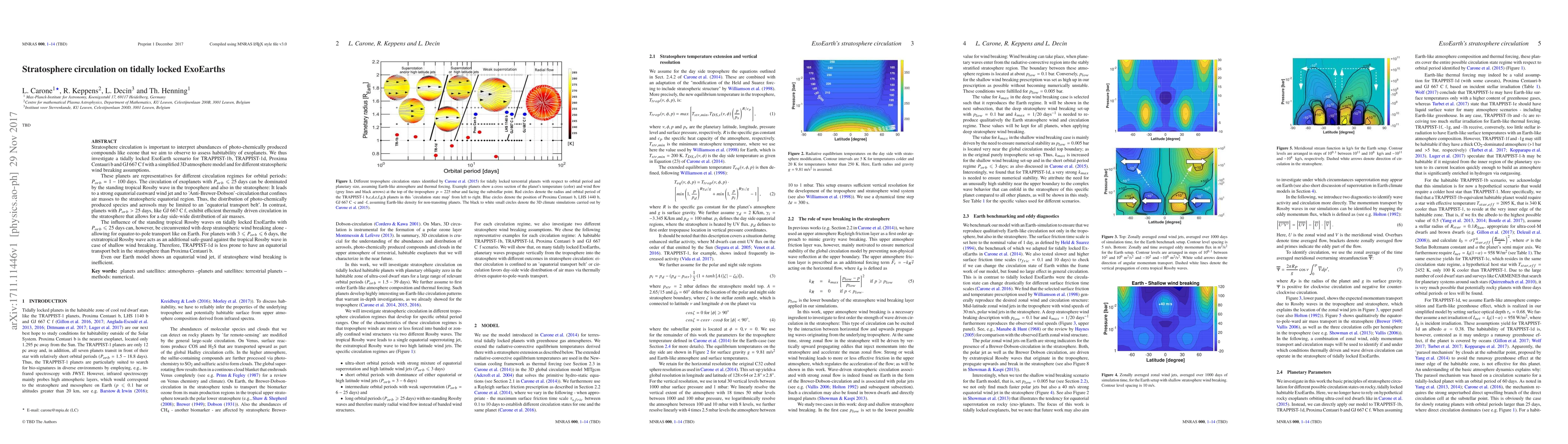 Stratosphere circulation is important to interpret abundances of photo-chemically produced compounds like ozone that we aim to observe to assess habitability of exoplanets. We thus investigate a tidally locked ExoEarth scenario for TRAPPIST-1b, TRAPPIST-1d, Proxima Centauri~b and GJ 667 C~f with a simplified 3D atmosphere model and for different stratospheric wind breaking assumptions. These planets are representatives for different circulation regimes for orbital periods: $P_{orb}=1-100$~days. The circulation of exoplanets with $P_{orb} \leq $ 25~days can be dominated by the standing tropical Rossby wave in the troposphere and also in the stratosphere: It leads to a strong equatorial eastward wind jet and to 'Anti-Brewer-Dobson'-circulation that confines air masses to the stratospheric equatorial region. Thus, the distribution of photo-chemically produced species and aerosols may be limited to an 'equatorial transport belt'. In contrast, planets with $P_{orb}>25$~days, like GJ~667~C~f, exhibit efficient thermally driven circulation in the stratosphere that allows for a day side-wide distribution of air masses. The influence of the standing tropical Rossby waves on tidally locked ExoEarths with $P_{orb} \leq 25$~days can, however, be circumvented with deep stratospheric wind breaking alone - allowing for equator-to-pole transport like on Earth. For planets with $3 \leq P_{orb} \leq 6$~days, the extratropical Rossby wave acts as an additional safe-guard against the tropical Rossby wave in case of shallow wind breaking. Therefore, TRAPPIST-1d is less prone to have an equatorial transport belt in the stratosphere than Proxima~Centauri~b. Even our Earth model shows an equatorial wind jet, if stratosphere wind breaking is inefficient.