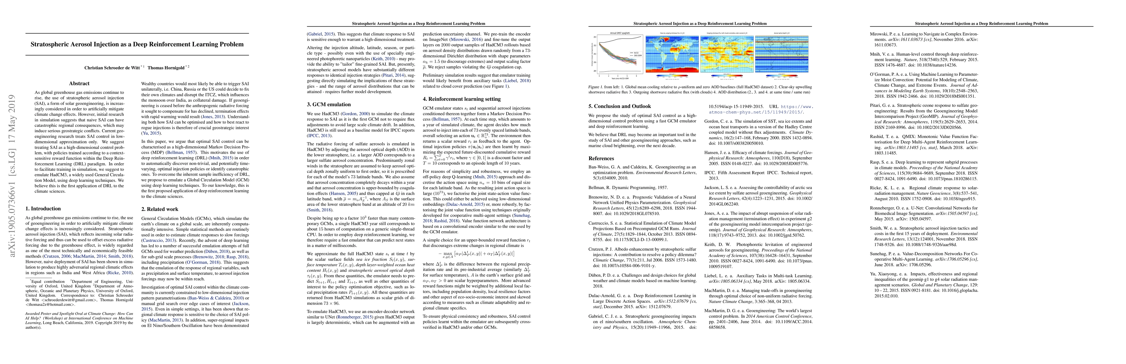 Researchers propose using deep reinforcement learning to optimize stratospheric aerosol injection (SAI) as a climate change mitigation method, with potential benefits in avoiding catastrophic regional consequences and geostrategic conflicts.