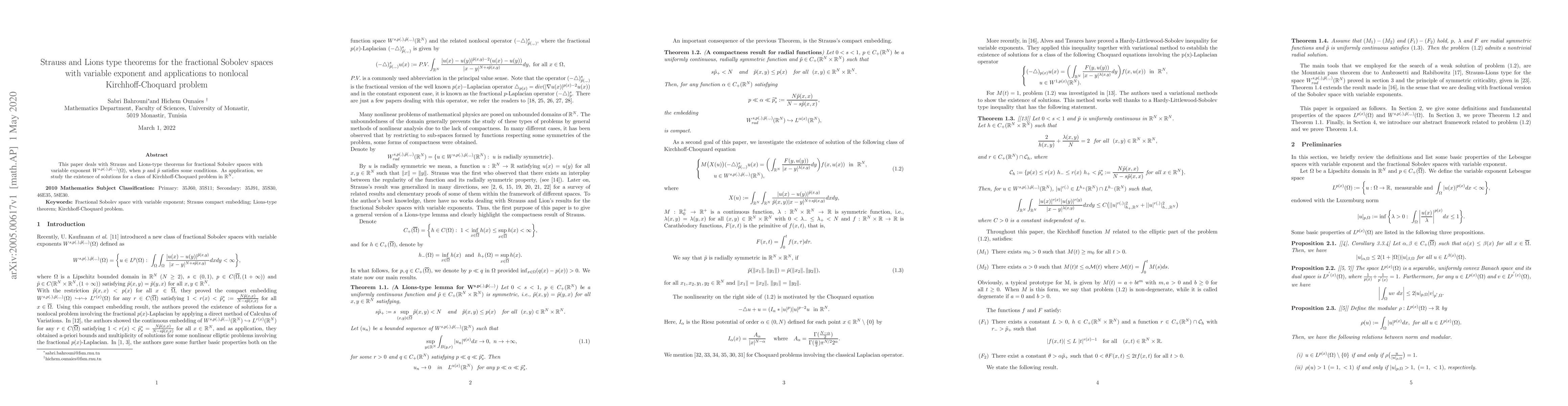 This paper deals with Strauss and Lions-type theorems for fractional Sobolev spaces with variable exponent $W^{s,p(.),\tilde{p}(.,.)}(\Omega)$, when $p$ and $\tilde{p}$ satisfies some conditions. As application, we study the existence of solutions for a class of Kirchhoff-Choquard problem in $\mathbb{R}^N$.