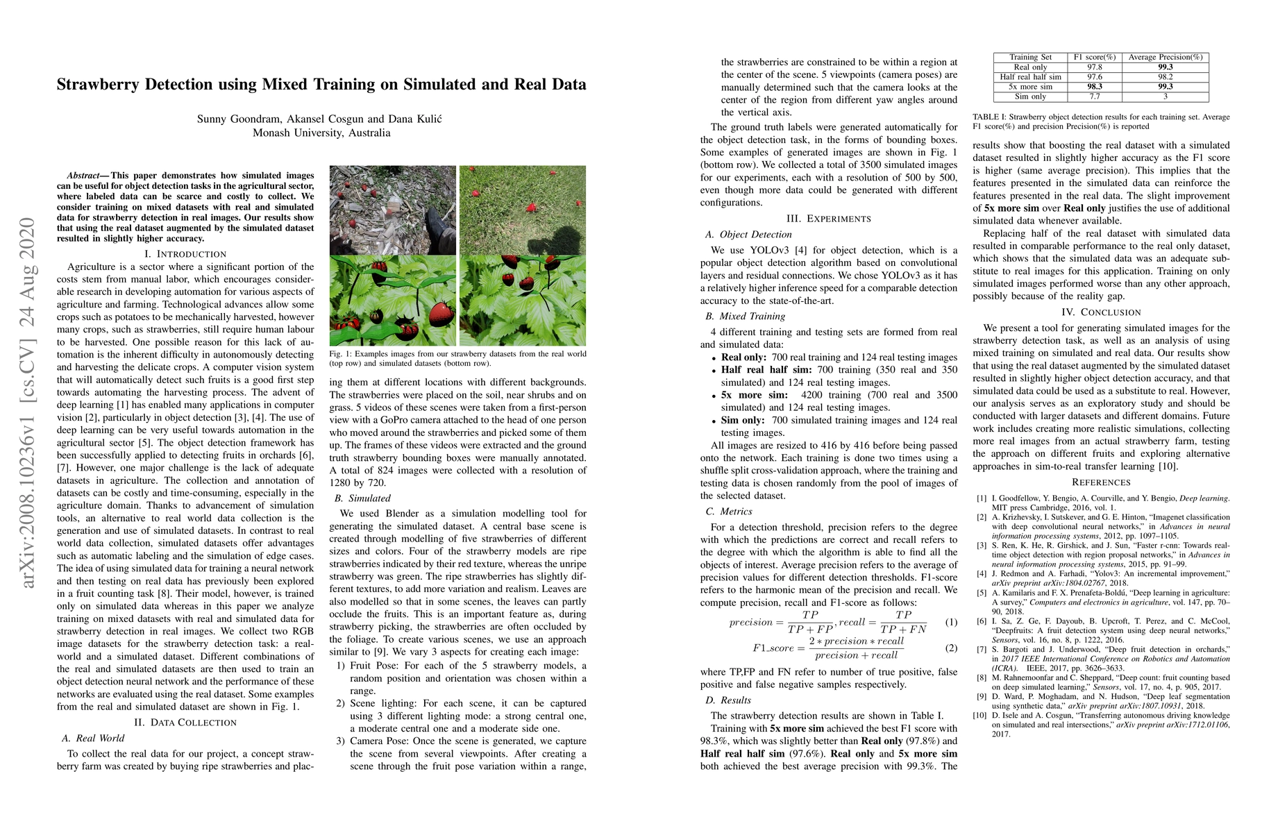 Training on mixed datasets of real and simulated data resulted in slightly higher accuracy for strawberry detection in real images.