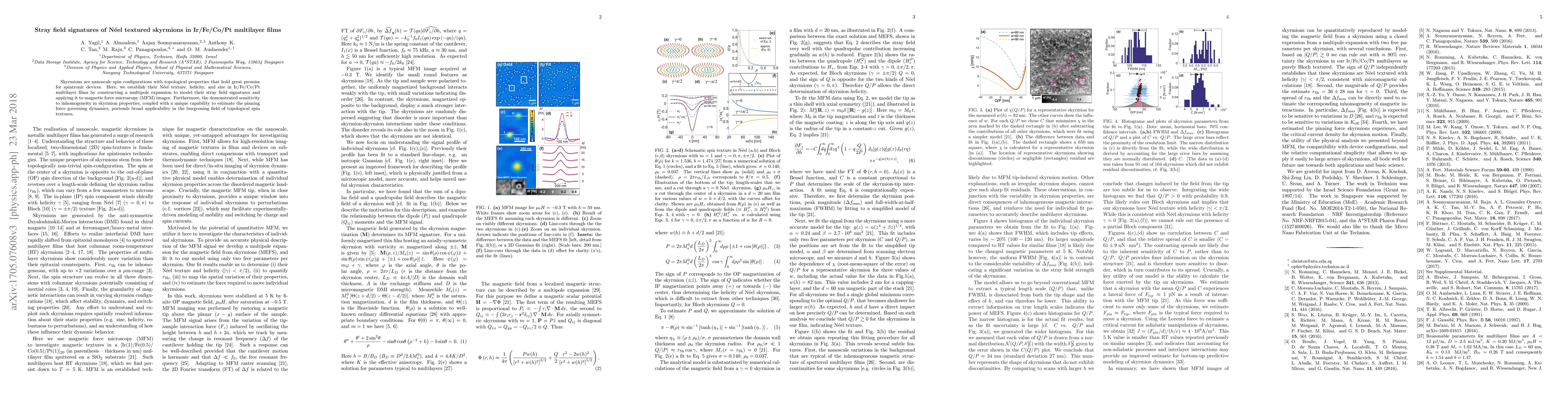 This research investigates the stray field signatures of N\'eel textured skyrmions in Ir/Fe/Co/Pt multilayer films, employing multipole expansion and magnetic force microscopy to analyze their helicity, size, and pinning forces, highlighting potential applications in spintronic devices.