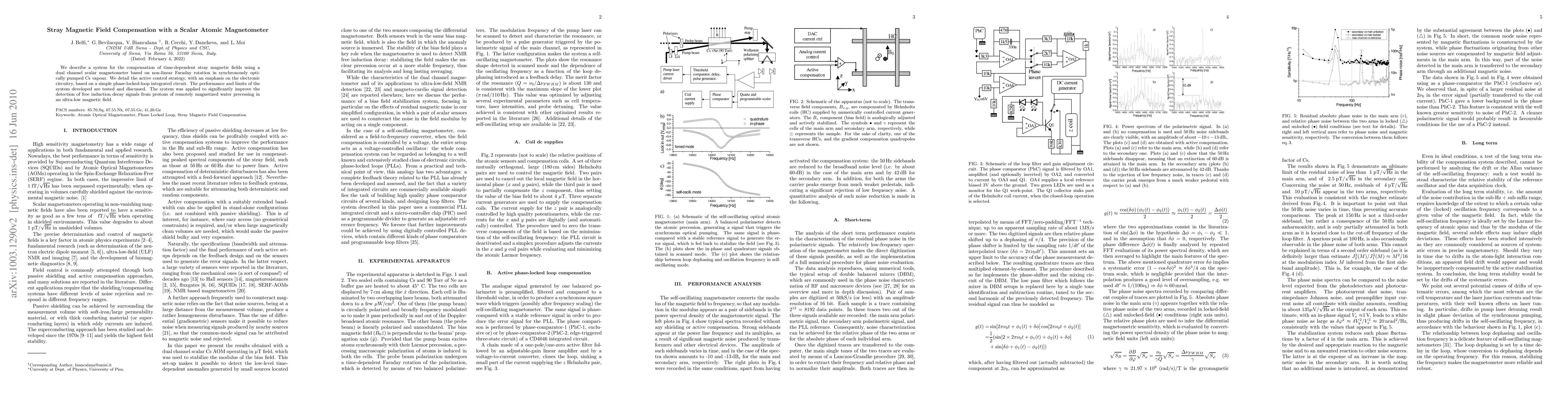 We describe a system for the compensation of time-dependent stray magnetic fields using a dual channel scalar magnetometer based on non-linear Faraday rotation in synchronously optically pumped Cs vapour. We detail the active control strategy, with an emphasis on the electronic circuitry, based on a simple phase-locked-loop integrated circuit. The performance and limits of the system developed are tested and discussed. The system was applied to significantly improve the detection of free induction decay signals from protons of remotely magnetized water precessing in an ultra-low magnetic field.