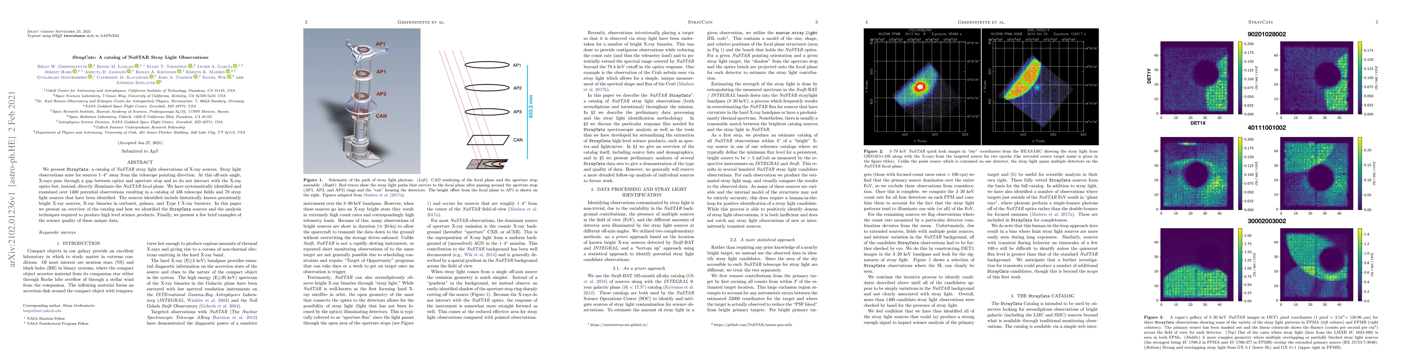 The research presents StrayCats, a catalog of NuSTAR stray light observations, systematically identifying over 1400 potential observations resulting in 436 telescope fields and 78 confirmed stray light sources, including X-ray binaries, pulsars, and Type I X-ray bursters.