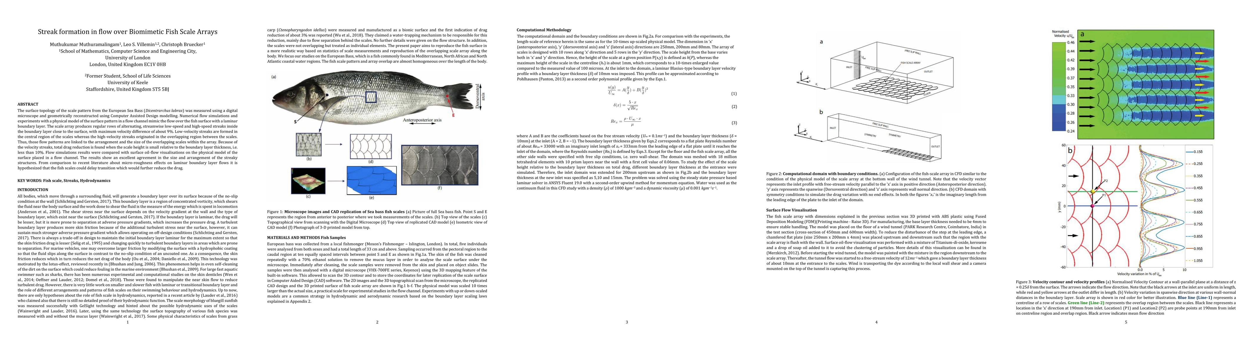 The surface topology of the scale pattern from the European Sea Bass (Dicentrarchus labrax ) was measured using a digital microscope and geometrically reconstructed using Computer Assisted Design modelling. Numerical flow simulations and experiments with a physical model of the surface pattern in a flow channel mimic the flow over the fish surface with a laminar boundary layer. The scale array produces regular rows of alternating, streamwise low-speed and high-speed streaks inside the boundary layer close to the surface, with maximum velocity difference of about 9%. Low-velocity streaks are formed in the central region of the scales whereas the high-velocity streaks originated in the overlapping region between the scales. Thus, those flow patterns are linked to the arrangement and the size of the overlapping scales within the array. Because of the velocity streaks, total drag reduction is found when the scale height is small relative to the boundary layer thickness, i.e. less than 10%. Flow simulations results were compared with surface oil-flow visualisations on the physical model of the surface placed in a flow channel. The results show an excellent agreement in the size and arrangement of the streaky structures. From comparison to recent literature about micro-roughness effects on laminar boundary layer flows it is hypothesized that the fish scales could delay transition which would further reduce the drag.